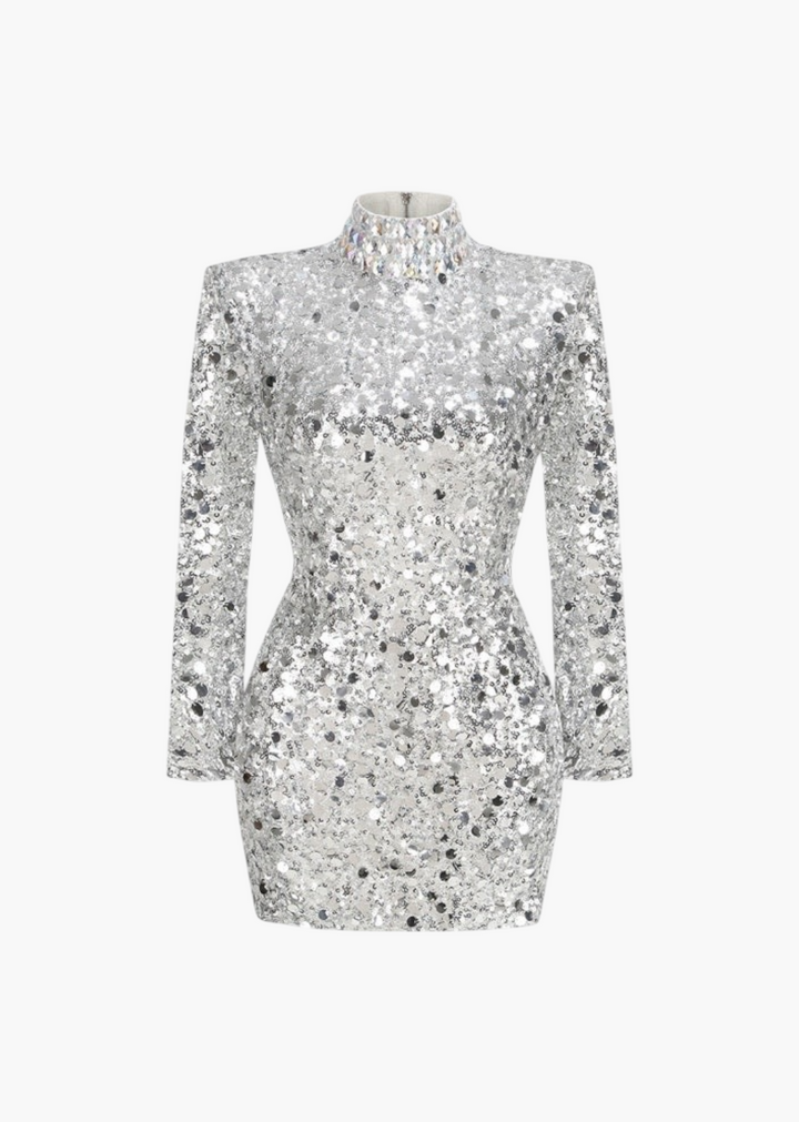 This high-shine mini dress is designed for a dazzling statement. It features a mock neckline and long sleeves with subtle shoulder pads for a structured look. The entire dress is covered in shimmering sequins, creating a form-fitting, body-hugging silhouette. A full-length back zipper provides a secure and easy fit. This dress is a perfect choice for parties, New Year's Eve, or any event where you want to stand out and sparkle.