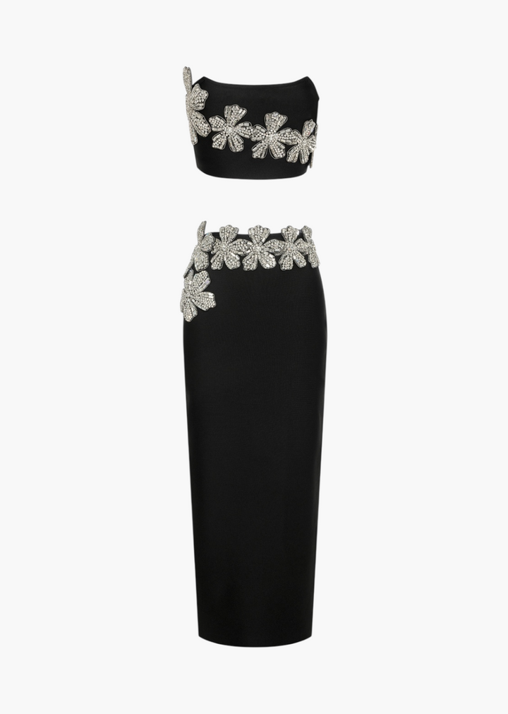 This two-piece set features a strapless crop top and a matching maxi skirt, both crafted from a smooth, structured fabric. The top is embellished with a floral design made from rhinestones, which cascades down the side of the skirt. The skirt has a high-waisted, form-fitting silhouette with a zipper closure at the back and a small slit at the hem.