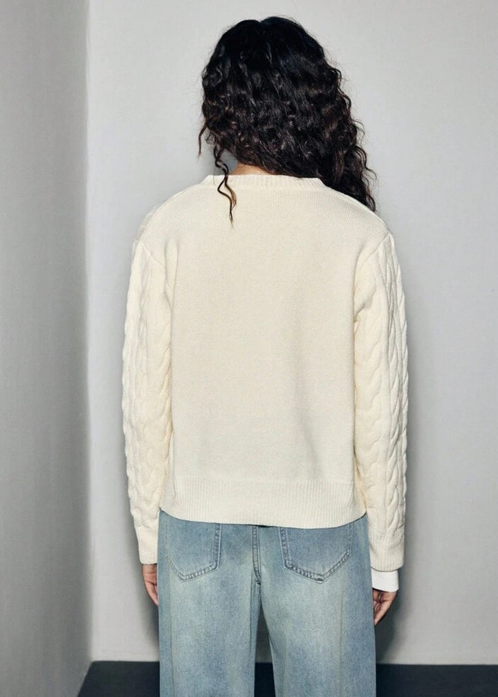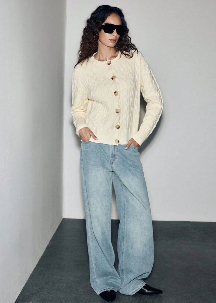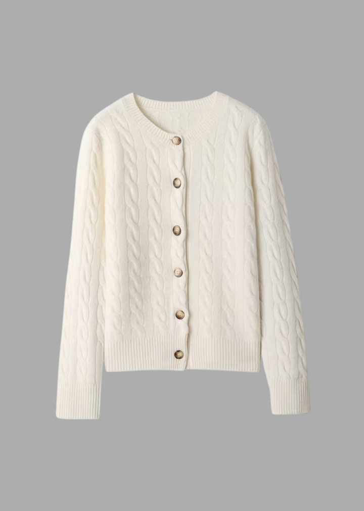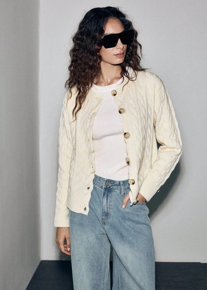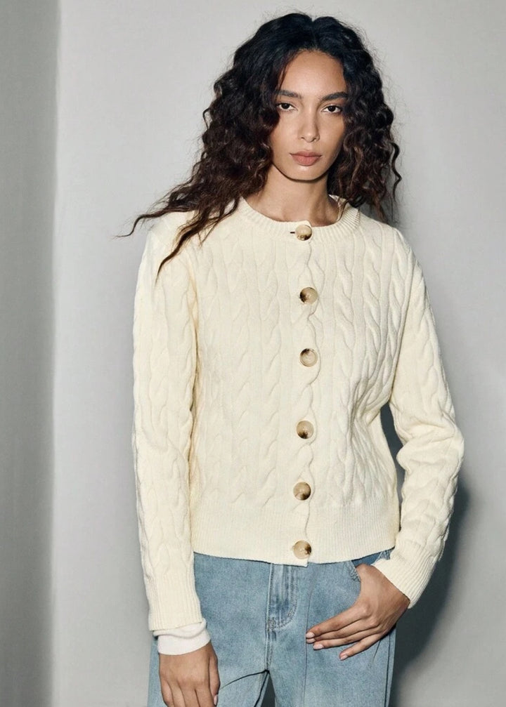 This classic cardigan features a crew neckline and a full button-front closure with contrasting buttons. The design is highlighted by a timeless cable knit pattern that adds texture and depth to the garment. The ribbed cuffs and hemensure a comfortable fit. This cardigan is a versatile layering piece suitable for various seasons.