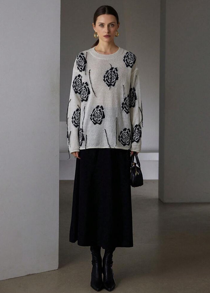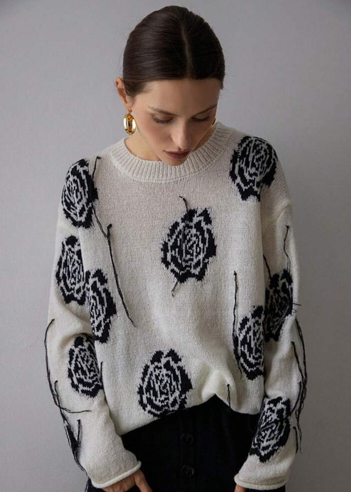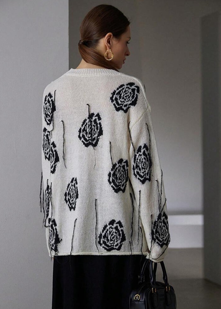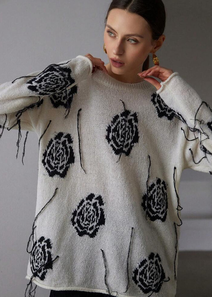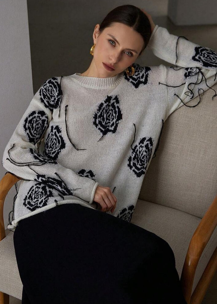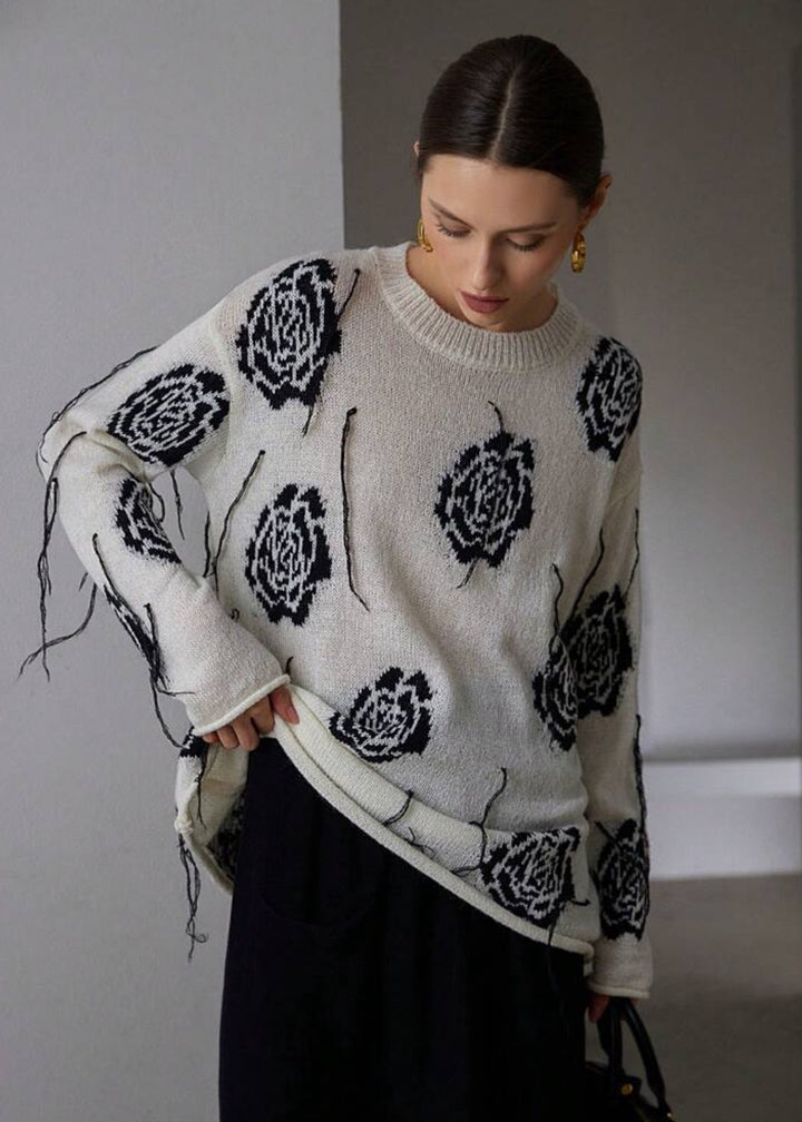 This sweater features a classic crew neckline and a relaxed silhouette, perfect for a cozy yet stylish look. The body and sleeves are adorned with a unique floral intarsia knit pattern and fringed thread detailing, creating a distinctive texture. The cuffs and hem are finished with a subtle rib knit.