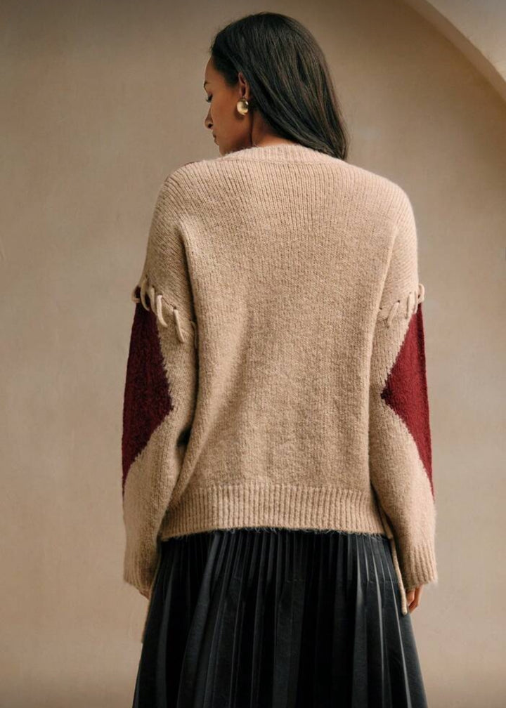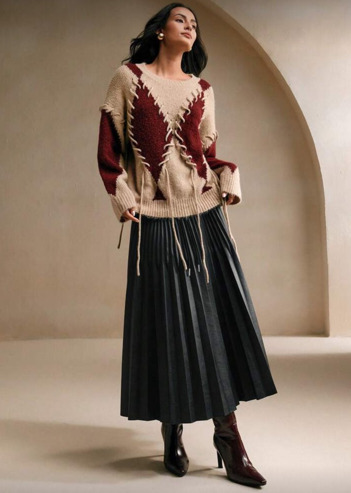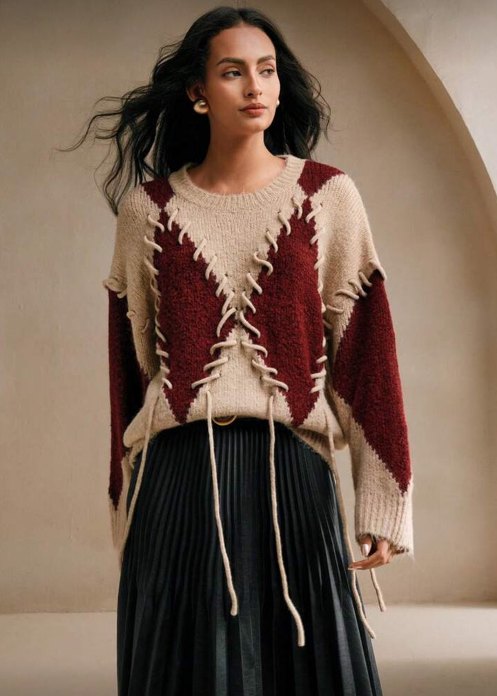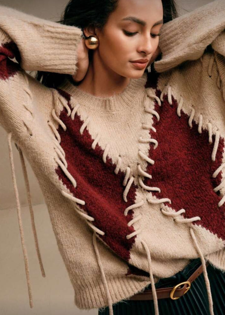 This cozy sweater is made from a soft knit fabrication and features a classic crewneck and long sleeves. Its most distinctive feature is the argyle pattern created with contrasting sections, which are connected by an intricate lace-up detail running across the front. The fit is relaxed, making it an effortless piece for casual wear.