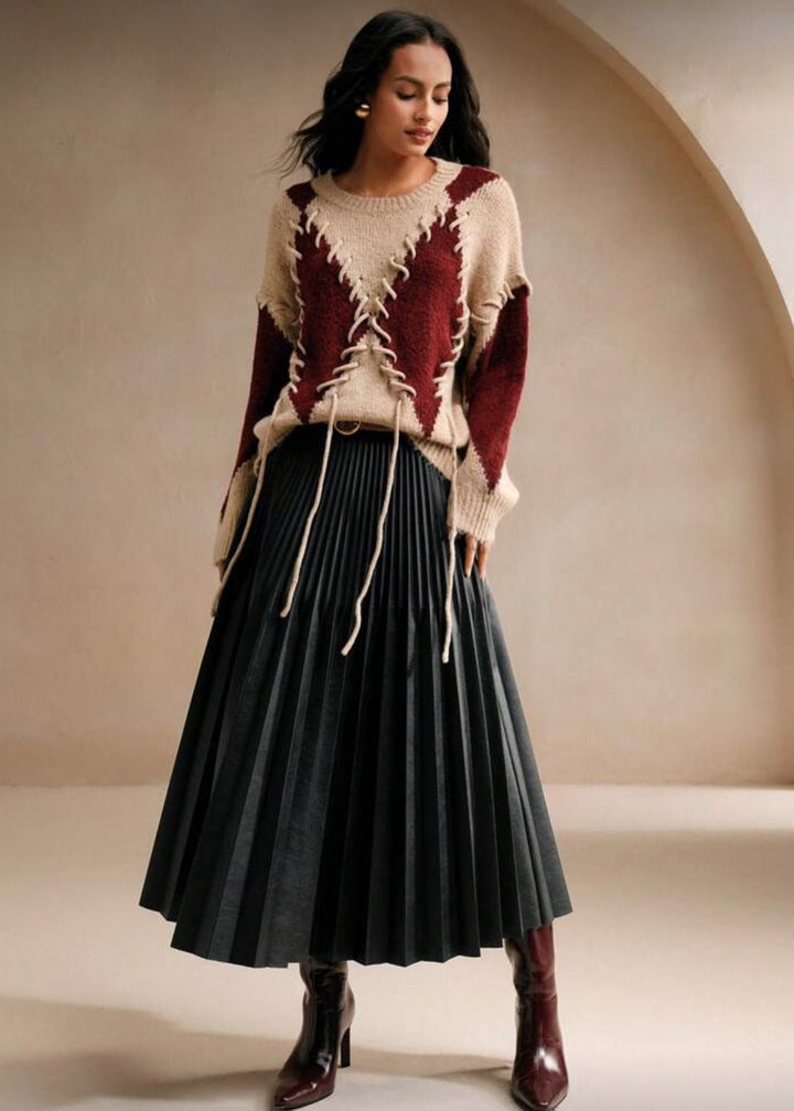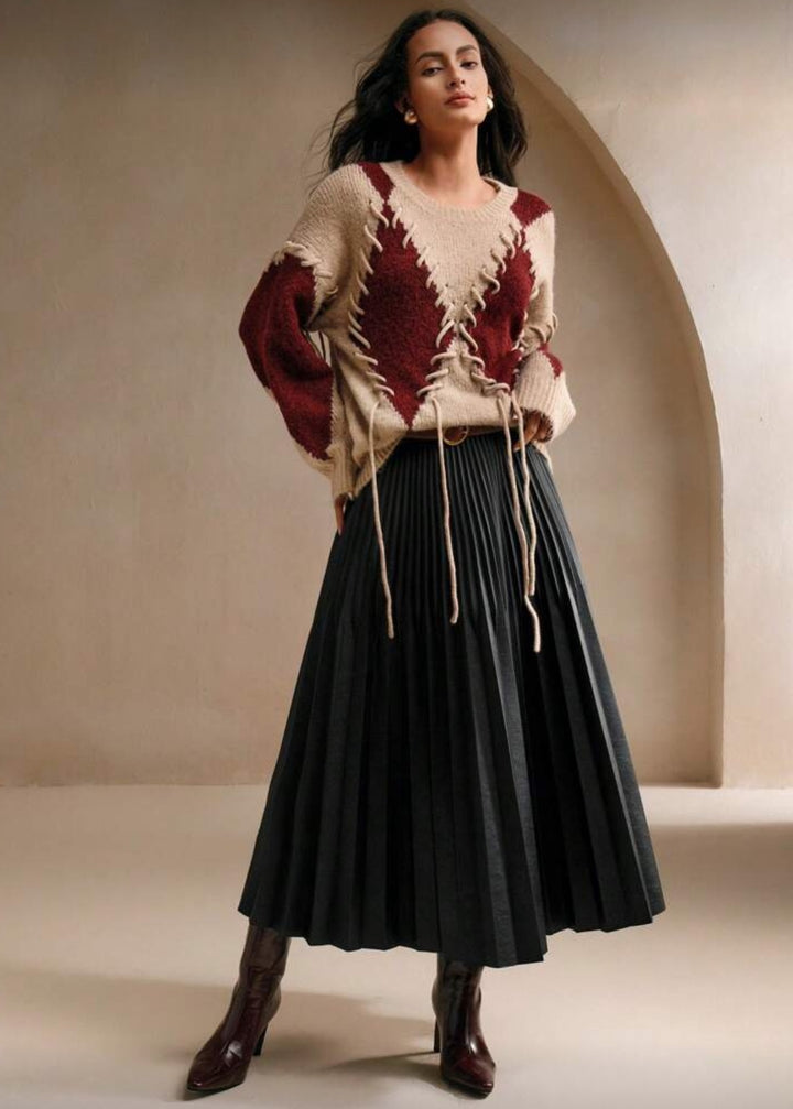 Pair this sweater with a flowing skirt, like the one shown, or with tailored trousers for a balanced, put-together look. For a casual outfit, style it with your favorite jeans and boots.