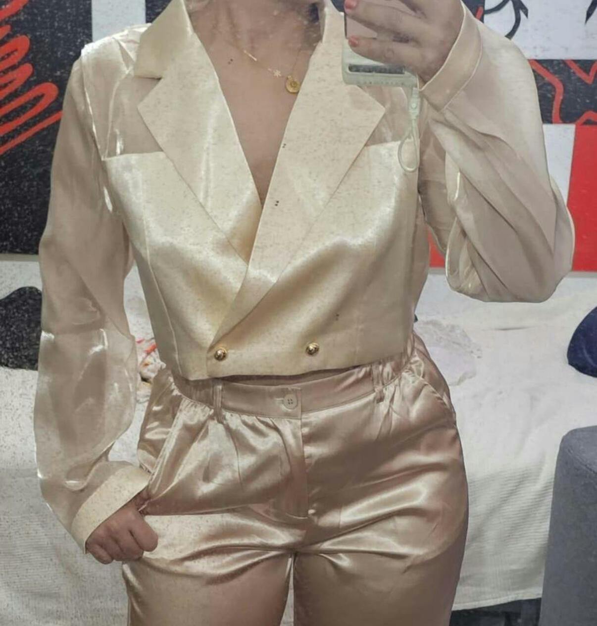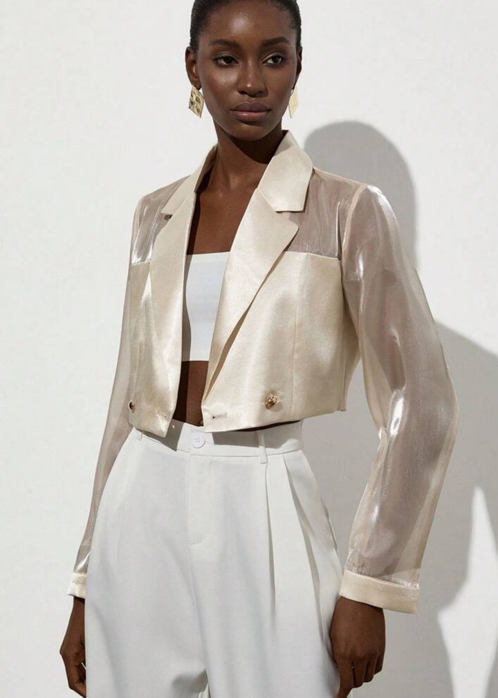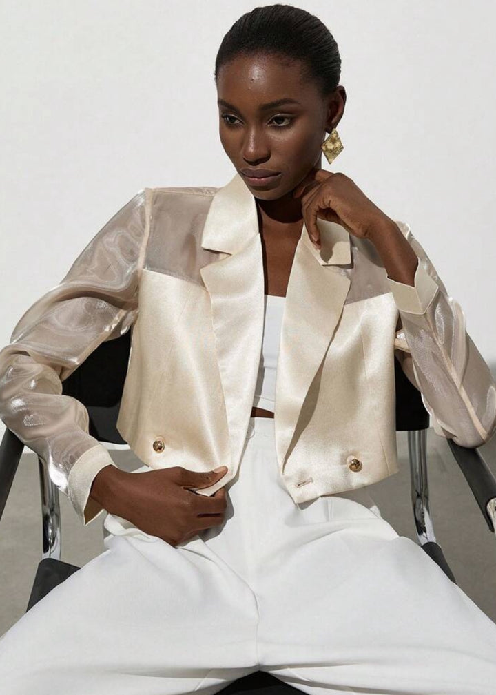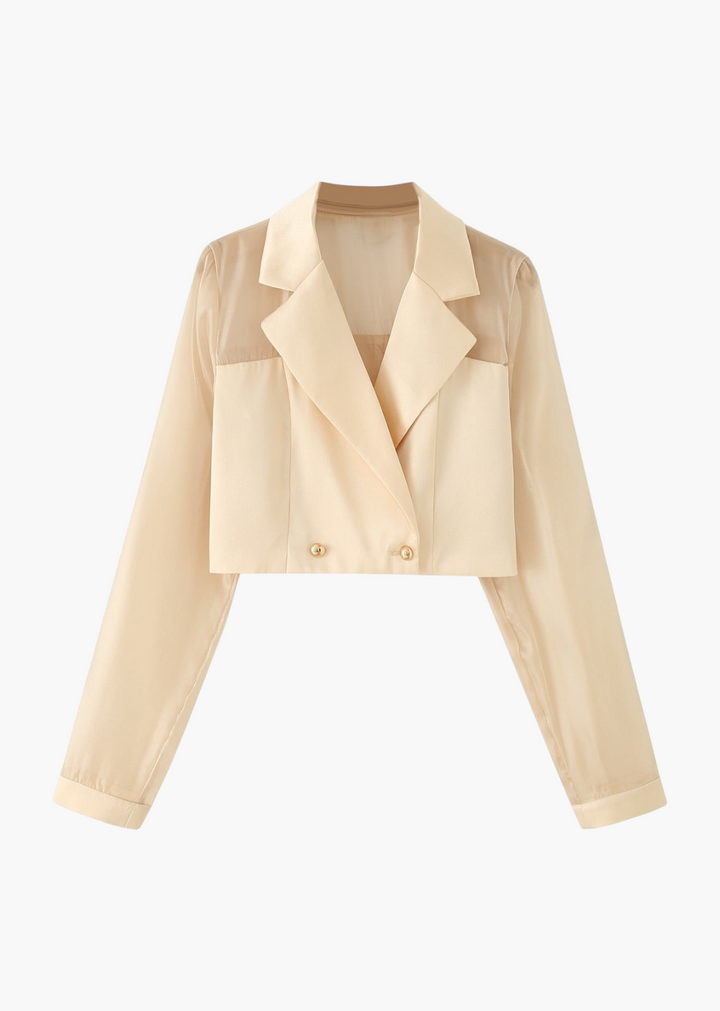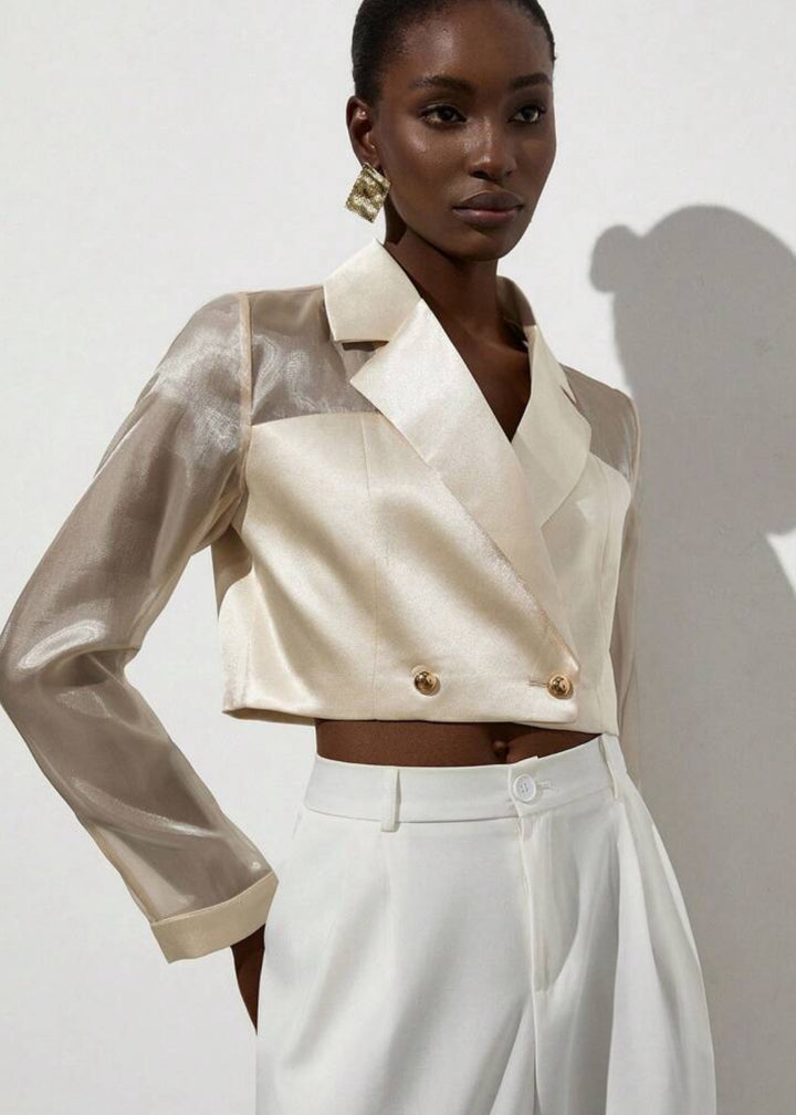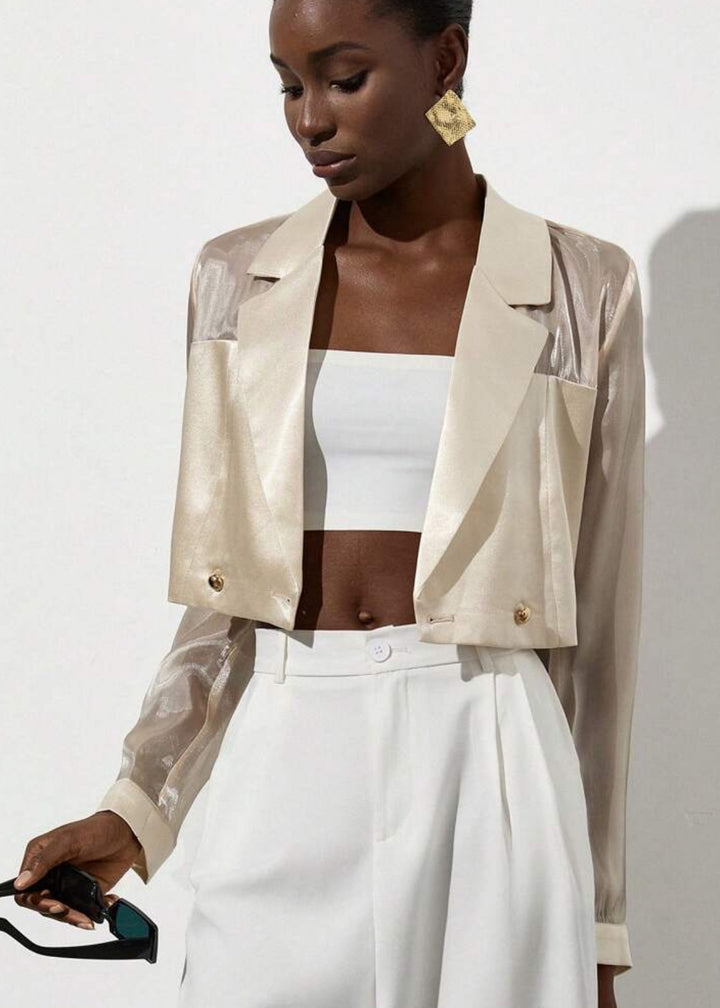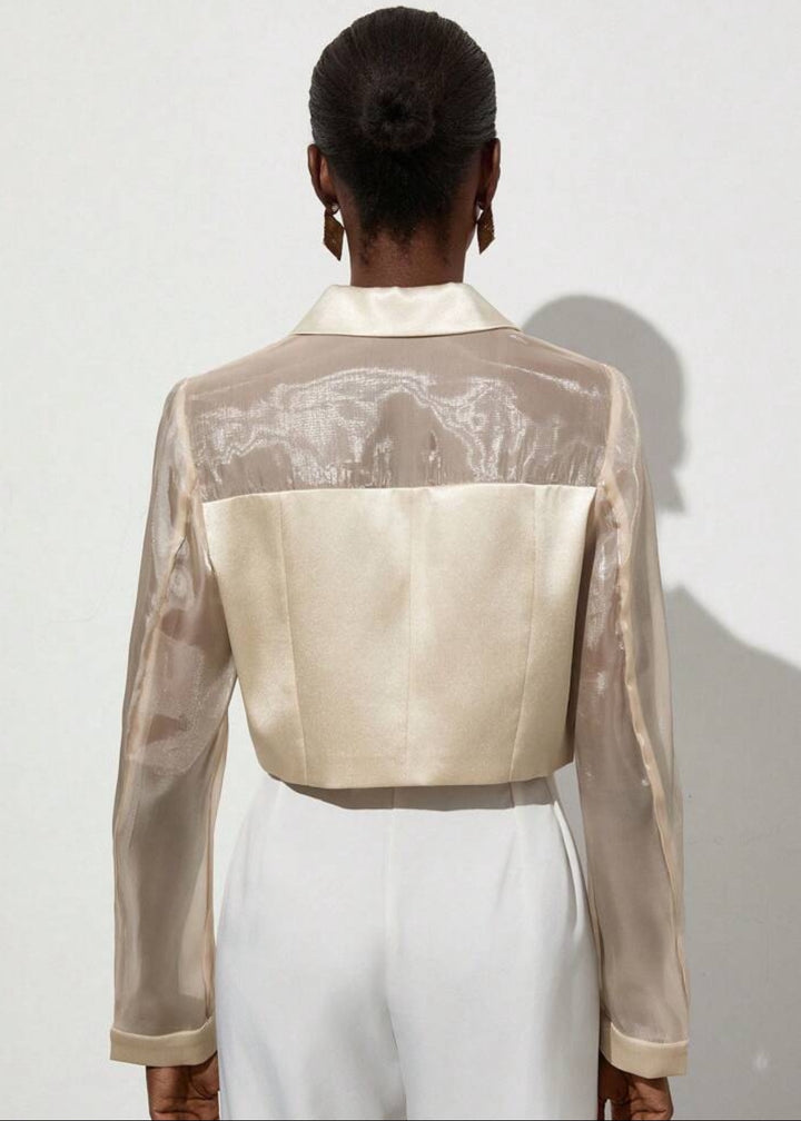 This is a modern take on a classic blazer, designed with a cropped silhouette that's perfect for warm weather or layering over a fitted top. It features a classic notch lapel and a single button front. The defining feature is the semi-sheer fabricused on the sleeves and upper back, creating a light, airy feel and a subtle contrast in textures. This blazer is perfect for creating a chic, polished look with a contemporary edge.