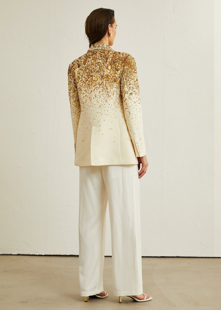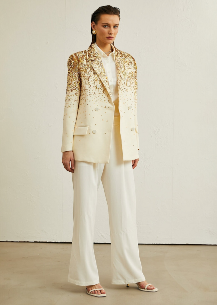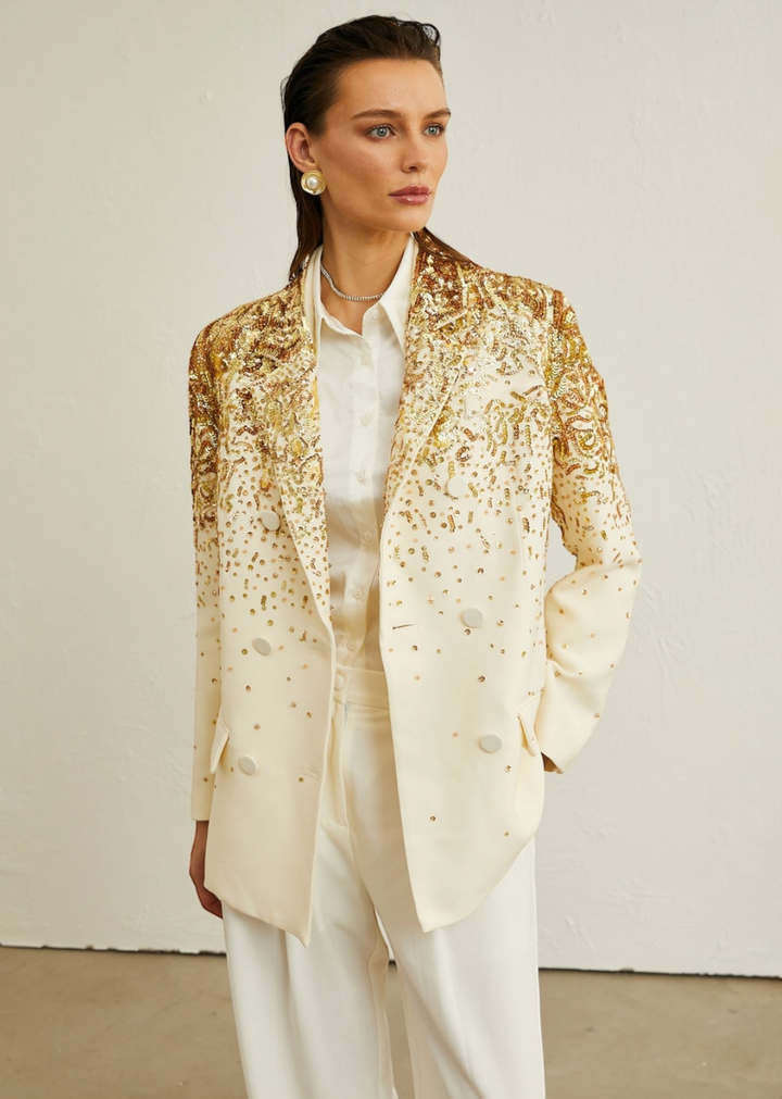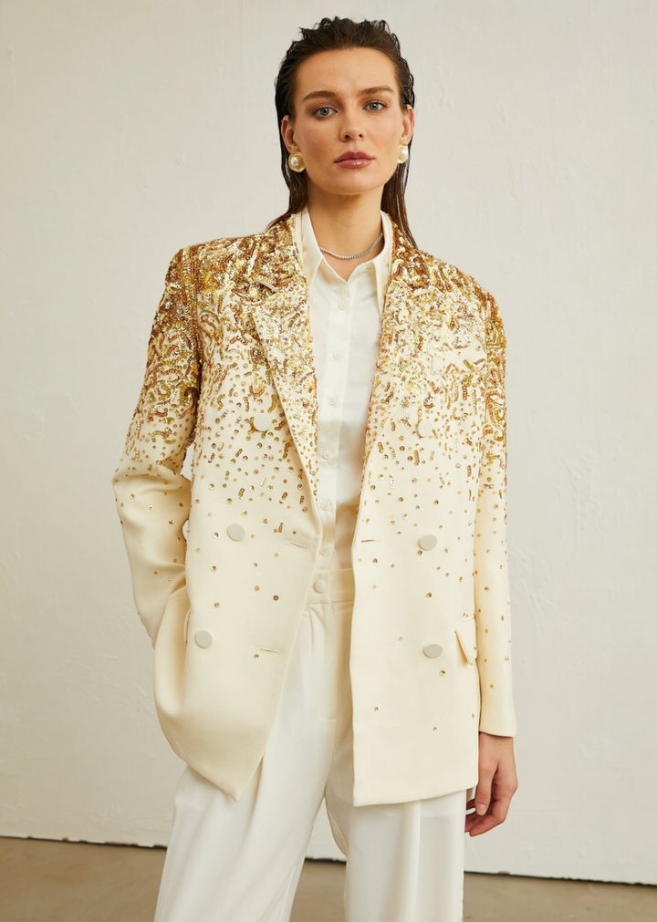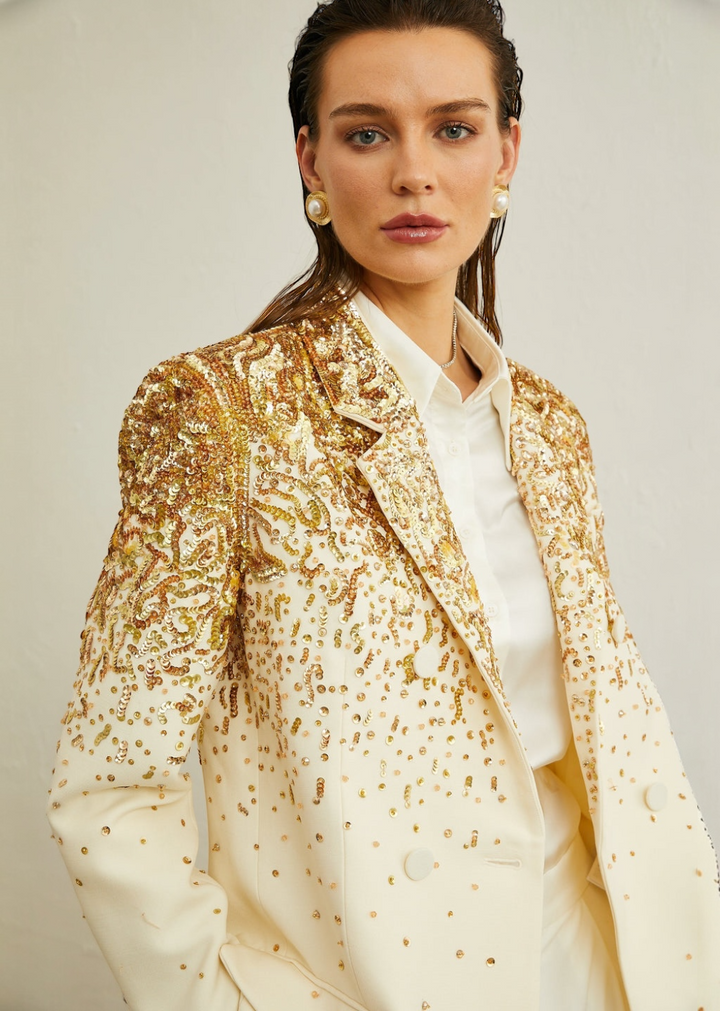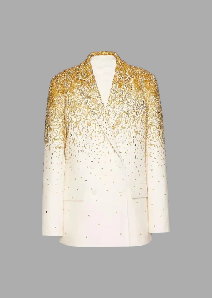 This statement blazer is a luxurious twist on classic tailoring. It features a structured fit with peak lapel collars and a double-breasted button closure. The standout feature is the intricate sequin and bead embellishment that is densely concentrated on the shoulders and collar, gradually cascading down the body in a beautiful ombre effect. The jacket is fully lined and boasts a sophisticated, boxy silhouette, making it an exceptional piece for special occasions or elevated evening wear.