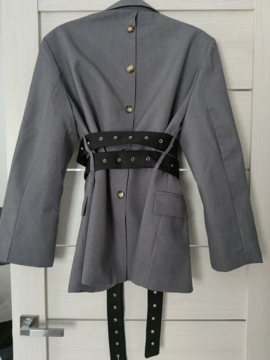 This blazer is a classic piece with an unexpected twist, offering a unique and flattering silhouette. It features a single-breasted front with a single-button closure at the waist, creating a cinched-in effect. The blazer has a notched lapel and a loose, flowing lower half that contrasts with the fitted waist. The back is distinguished by a row of buttons running vertically down the spine, adding a decorative and subtle detail. The sleeves are long with a button detail at the cuff. This versatile blazer can be worn for business or a sophisticated evening look.