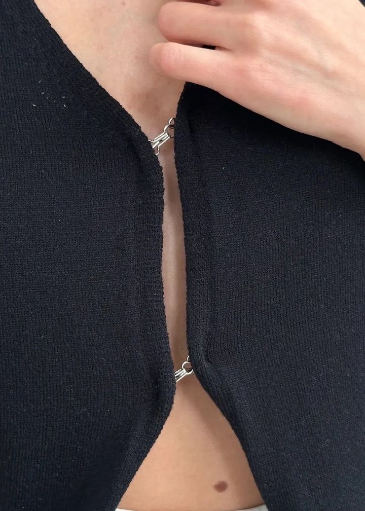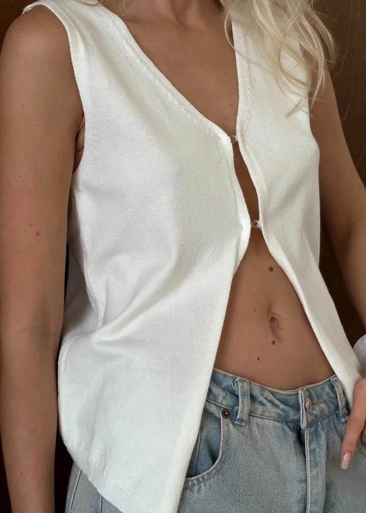 Introducing the V-Neck Front Closure Sleeveless Top, a versatile addition to your wardrobe designed for modern style and effortless layering. This top features a unique front closure with metallic accents that adds a touch of sophistication while ensuring a comfortable fit. The sleeveless design promotes breathability, making it perfect for warmer weather or layering under jackets and cardigans.