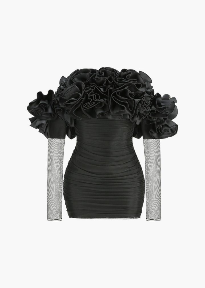 This glamorous mini dress combines a sophisticated silhouette with dramatic details. It features an off-the-shoulder neckline adorned with large, textured ruffles that cascade across the bust and extend onto the upper arms. The body of the dress is ruched to create a flattering, body-hugging fit. Sheer mesh long sleeves add an elegant touch. A concealed back zipper ensures a smooth and seamless look. This dress is perfect for special occasions, cocktail parties, and elegant evenings out.