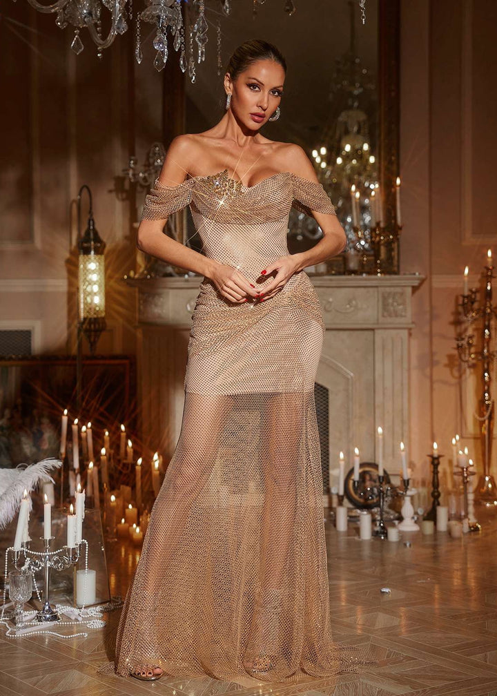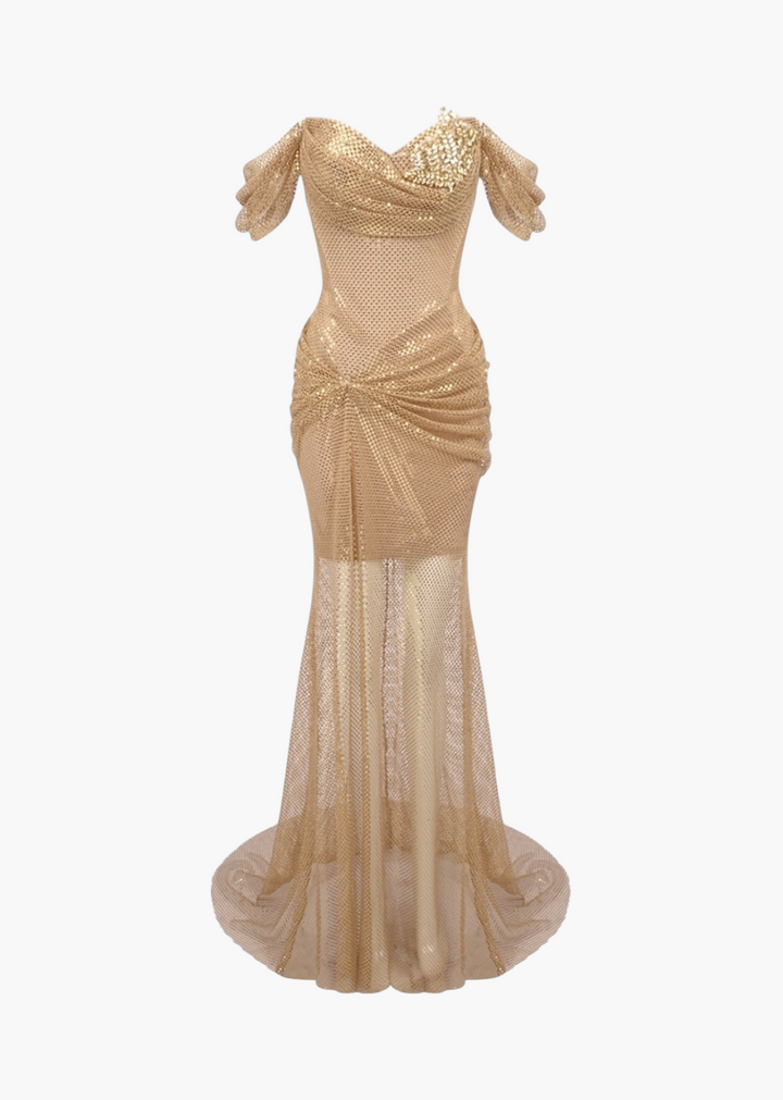 This elegant formal dress features a sweetheart neckline and unique off-the-shoulder short sleeves with gathered detailing. The bodice is fitted and adorned with intricate embellishments around the neckline. A gathered detail at the waistline leads to a bodycon inner layer with a flowing sheer mesh overlay that extends to a floor-sweeping hem.