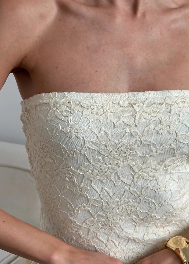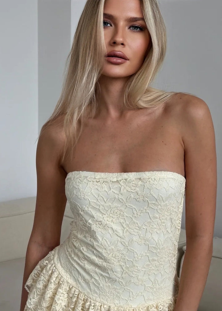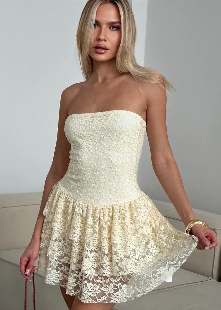 Introducing the Strapless Lace Overlay Flared Mini Dress, a stunning piece that combines elegance and playfulness. This dress features a strapless design that accentuates the neckline while the flared mini skirt adds a lively touch. Made with a delicate lace overlay, it brings a romantic feel, making it perfect for various occasions. Its lightweight fabric ensures comfort and ease of movement.
