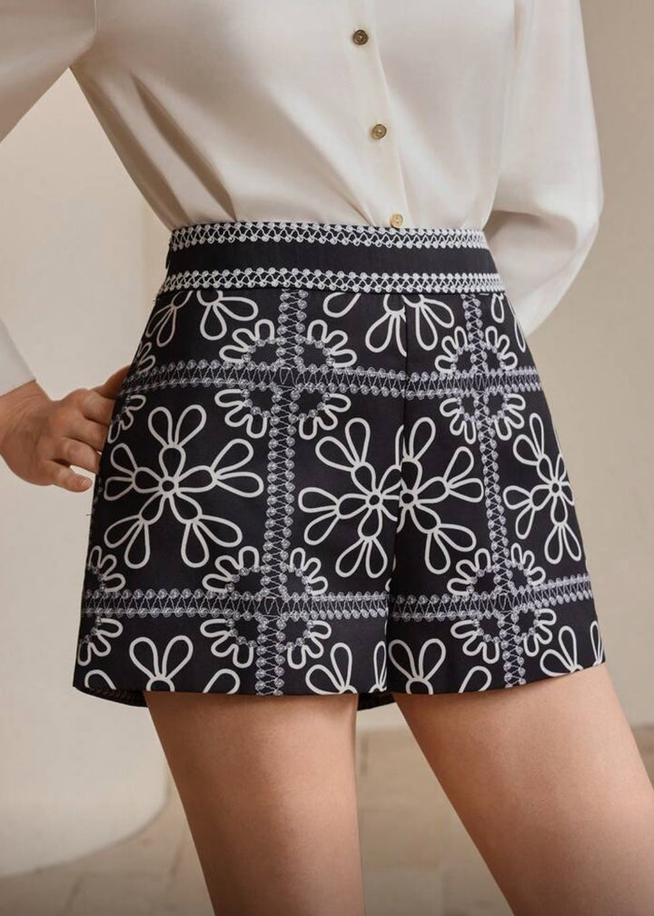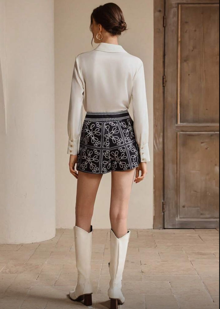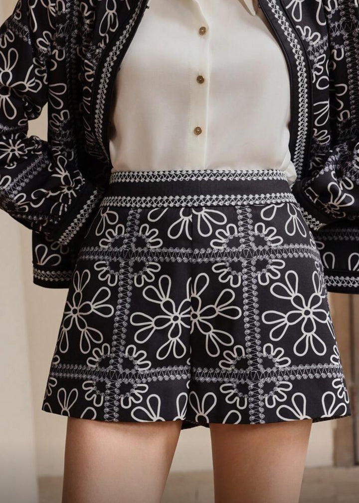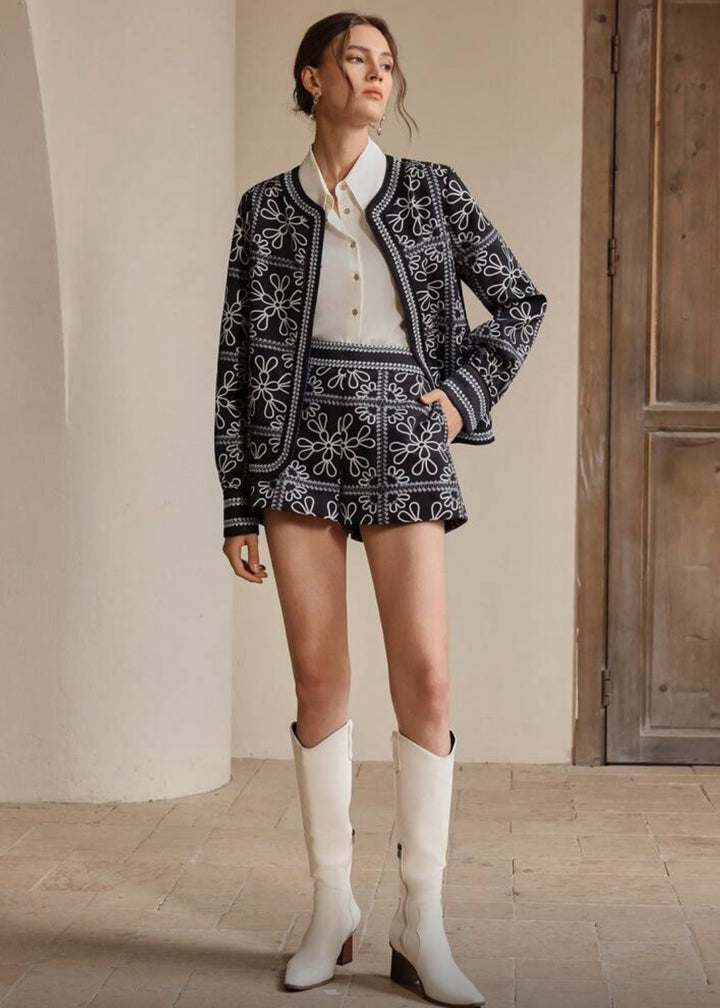 This two-piece set features a collarless jacket and matching mini shorts, both adorned with an intricate embroidered pattern. The jacket has a relaxed fit with an open front and subtle trim details, while the shorts offer a comfortable fit with functional pockets. This set provides a chic and coordinated look.