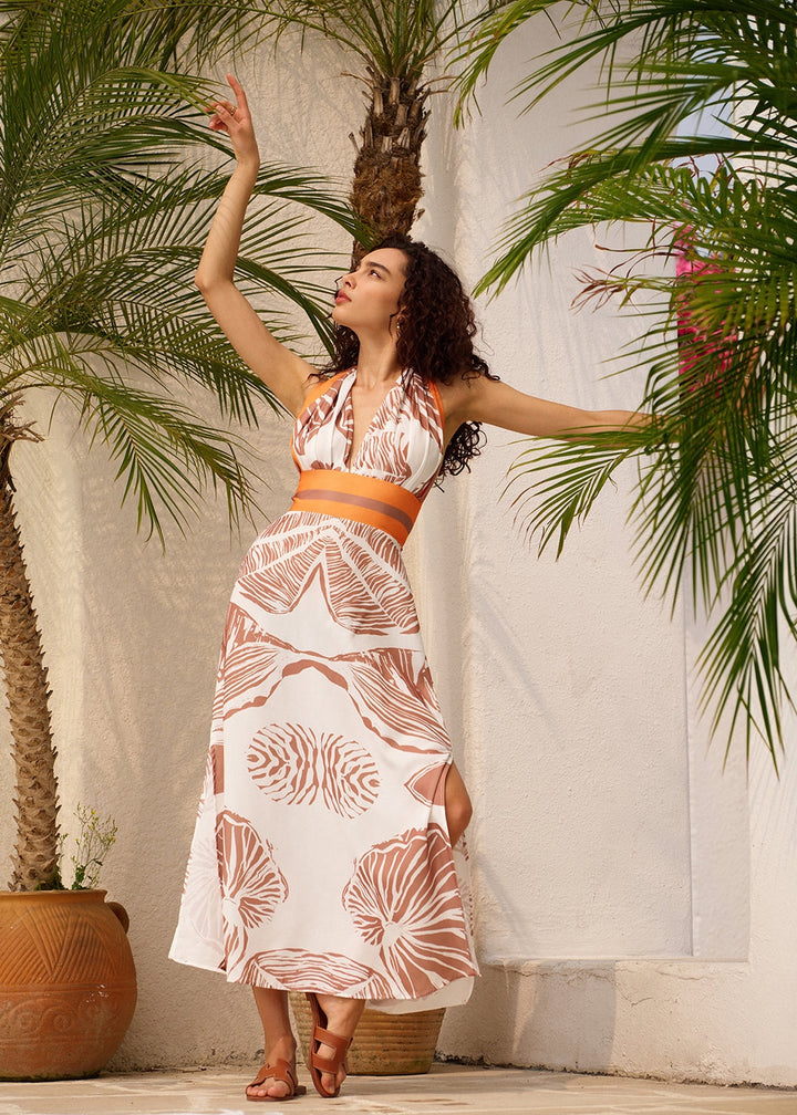 This maxi dress is designed to make a statement with its dynamic silhouette and stylish details. The top features a V-neck halter bodice that ties at the nape, creating a flattering and adjustable fit. The midsection is adorned with elegant cutouts at the sides, revealing a hint of skin and leading to an elasticated back for a secure and comfortable feel. A high slit on one side of the flowing maxi skirt adds a dramatic and sophisticated touch. The dress is detailed with a unique, textured leaf-inspired pattern throughout, making it a perfect choice for a resort getaway or a special outdoor event.