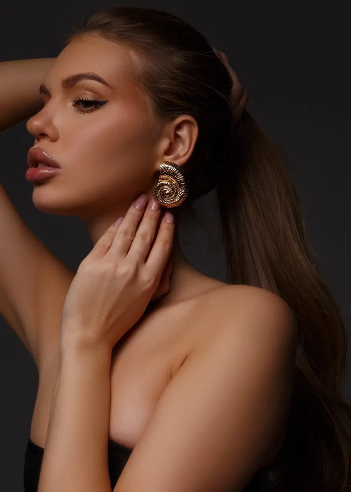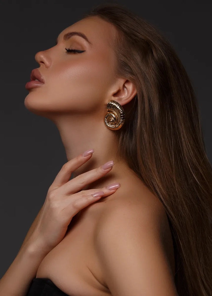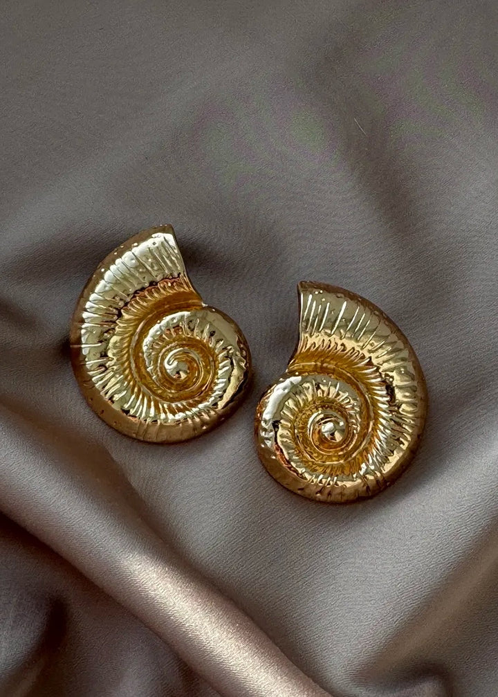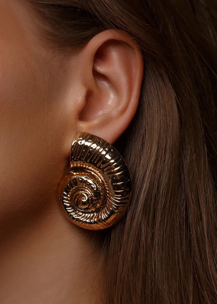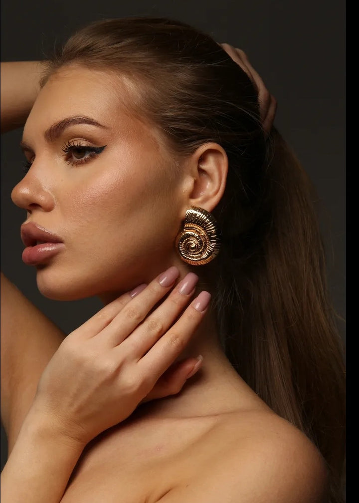 These statement earrings are a beautiful fusion of modern design and natural inspiration. They feature a unique, spiral shell motif with a rich, ribbed texture that follows the curve of the design. The earrings are crafted with a polished finish and are designed to sit securely on the lobe with a post-back closure. Their substantial size and intricate detailing make them a captivating focal point for any ensemble. These earrings are a perfect choice for adding an artistic and elegant touch to both everyday and special occasion looks.