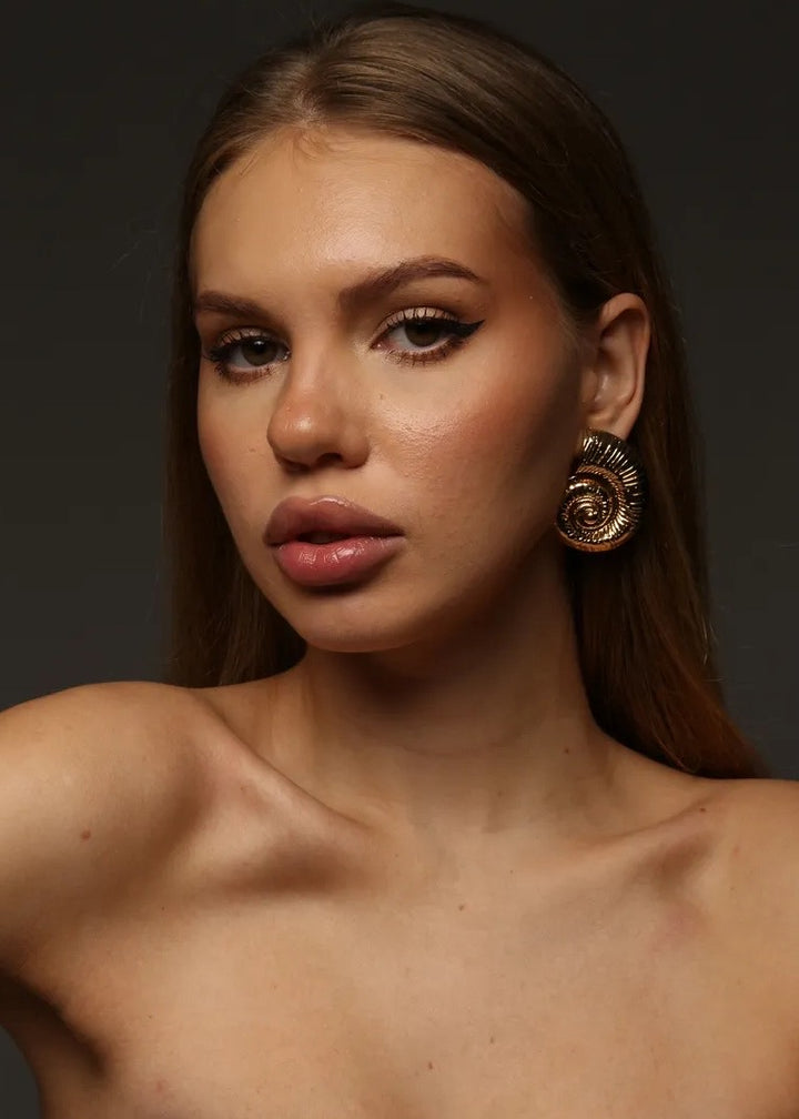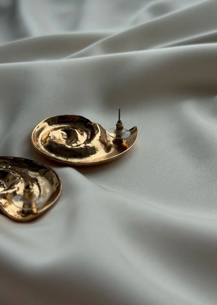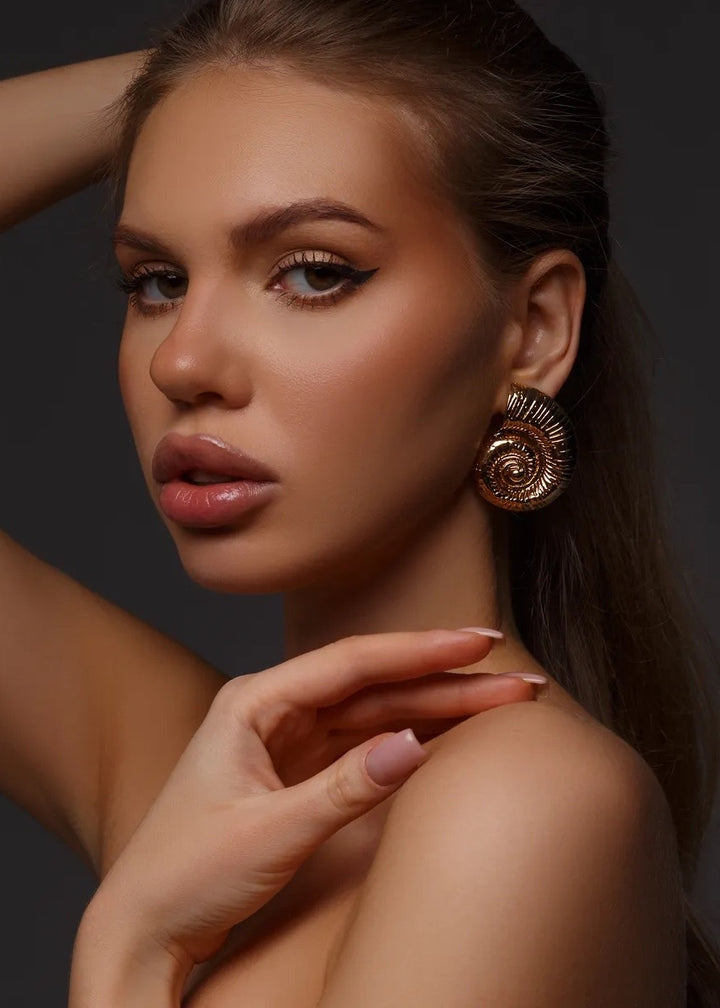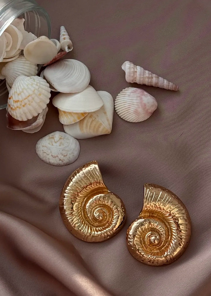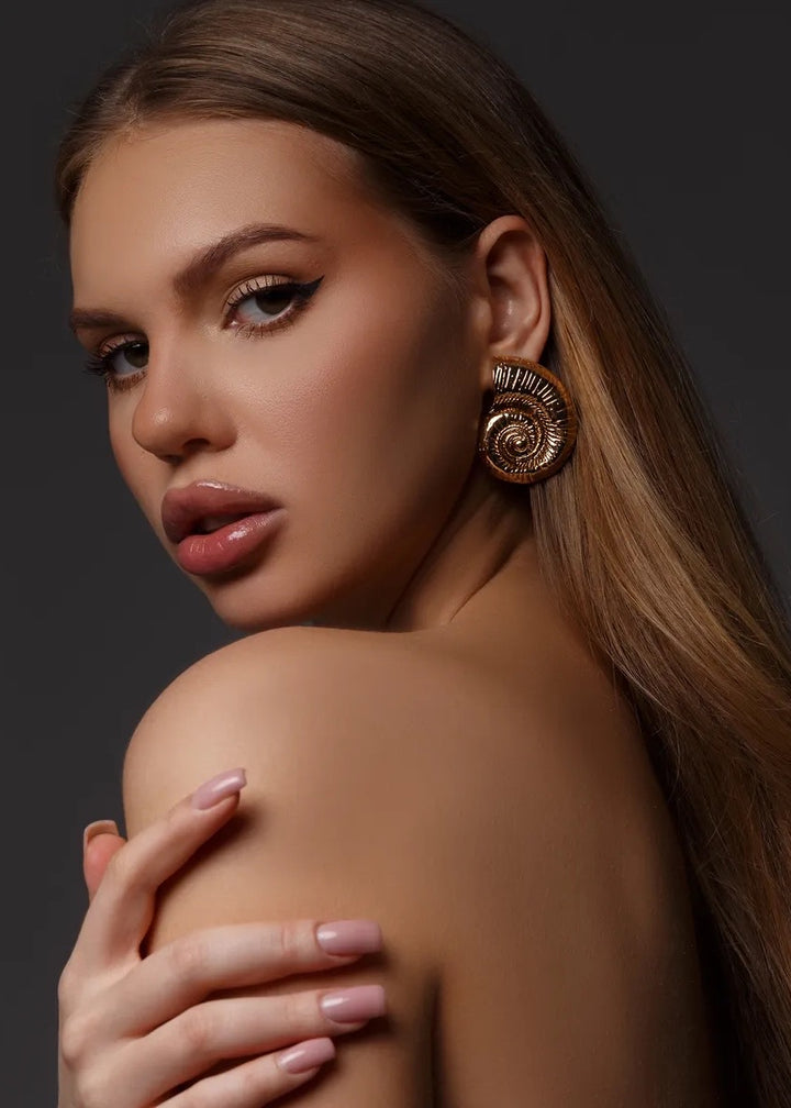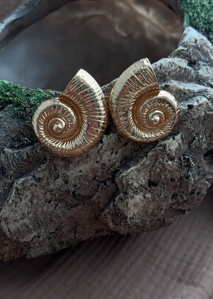 These statement earrings are a beautiful fusion of modern design and natural inspiration. They feature a unique, spiral shell motif with a rich, ribbed texture that follows the curve of the design. The earrings are crafted with a polished finish and are designed to sit securely on the lobe with a post-back closure. Their substantial size and intricate detailing make them a captivating focal point for any ensemble. These earrings are a perfect choice for adding an artistic and elegant touch to both everyday and special occasion looks.