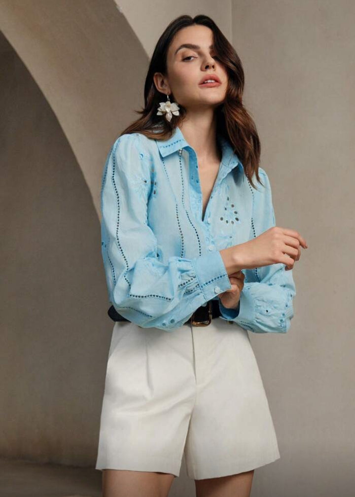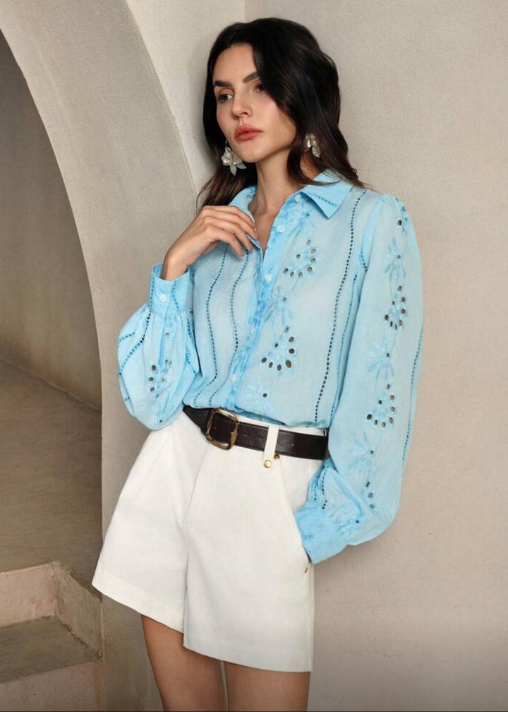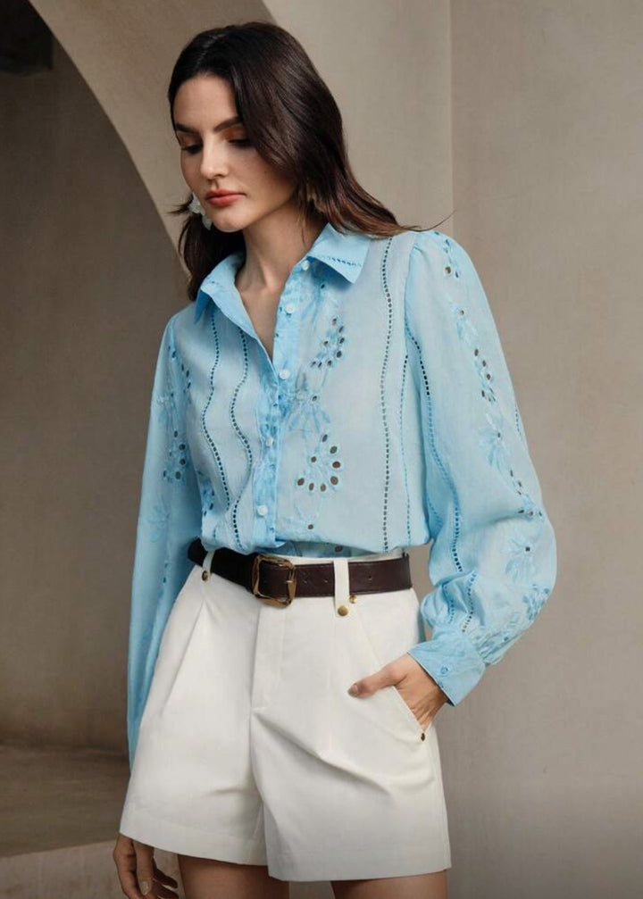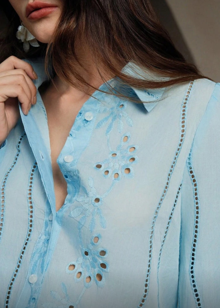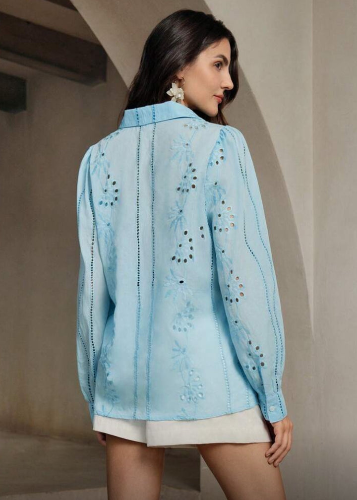 This button-down shirt is crafted from a lightweight fabric and features intricate eyelet embroidery patterns across the sleeves and bodice. It has a classic collar and long sleeves with cuffs, offering a sophisticated yet airy feel. The shirt can be worn for a relaxed fit or styled for a more structured look.