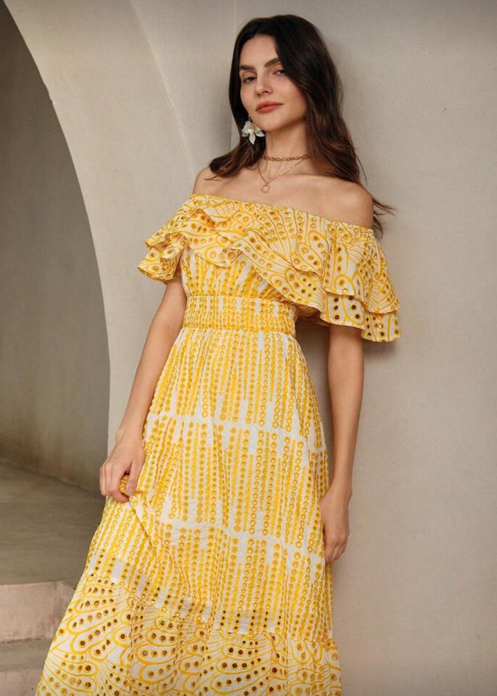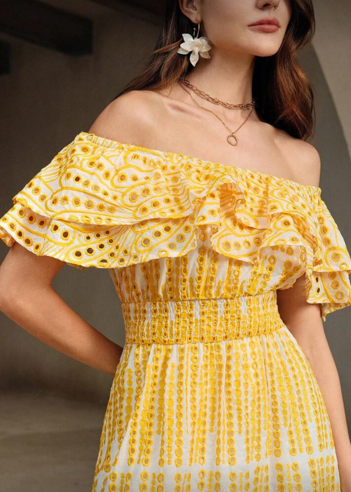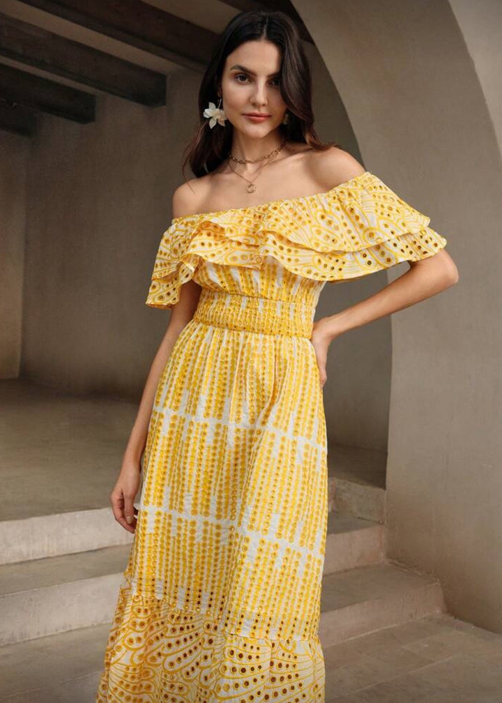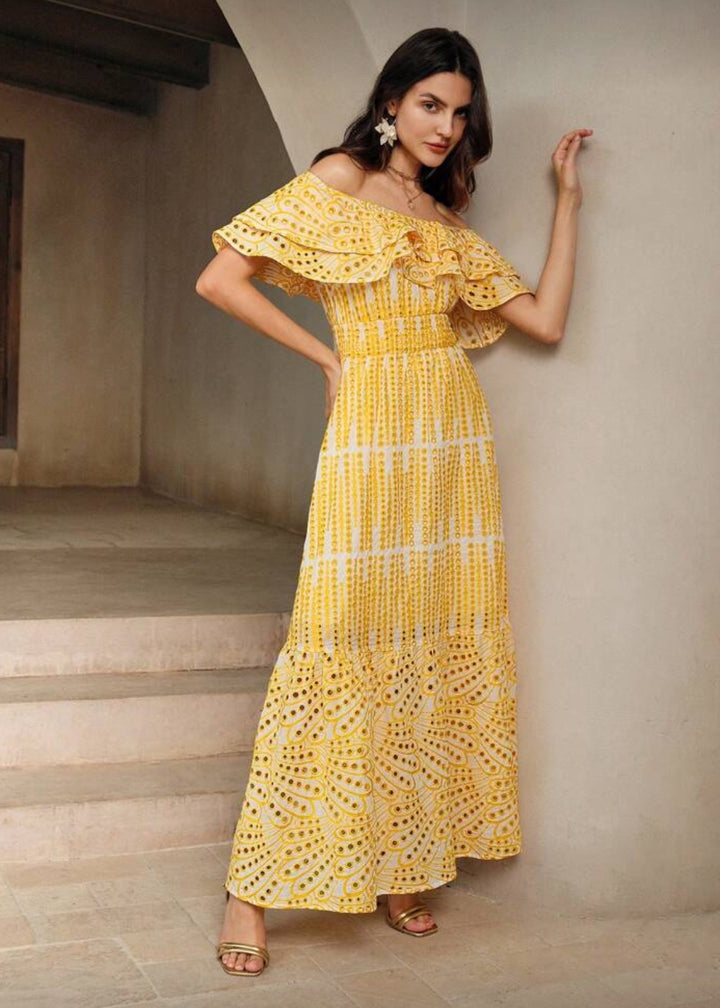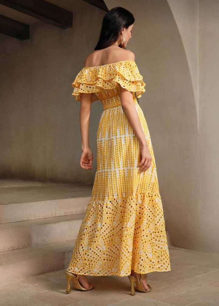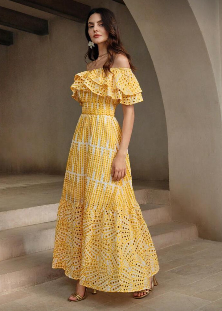 This maxi dress features a smocked bodice and an off-the-shoulder neckline with playful ruffle details. The skirt is adorned with eyelet embroidery and falls to a flowing silhouette, creating a graceful and comfortable fit. This dress is a perfect choice for both casual outings and special occasions.