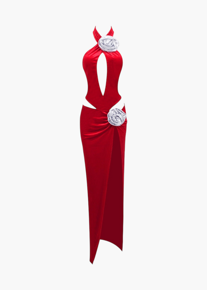 This glamorous gown is crafted from a plush velvet fabric, offering a luxurious feel and a rich drape. The dress features a halter neckline that cinches at the neck, creating an open-back design and a keyhole cutout at the chest. Three-dimensional, sculpted rose appliques are prominently placed at the collarbone and waist, adding a touch of bold, artistic flair. Strategic cutouts at the waist create a modern and alluring silhouette. The fitted maxi-length skirt includes a high side slit, designed to provide elegant movement and showcase the leg. This gown is an exceptional choice for black-tie events, formal galas, or any occasion where you want to make a sophisticated and unforgettable statement.