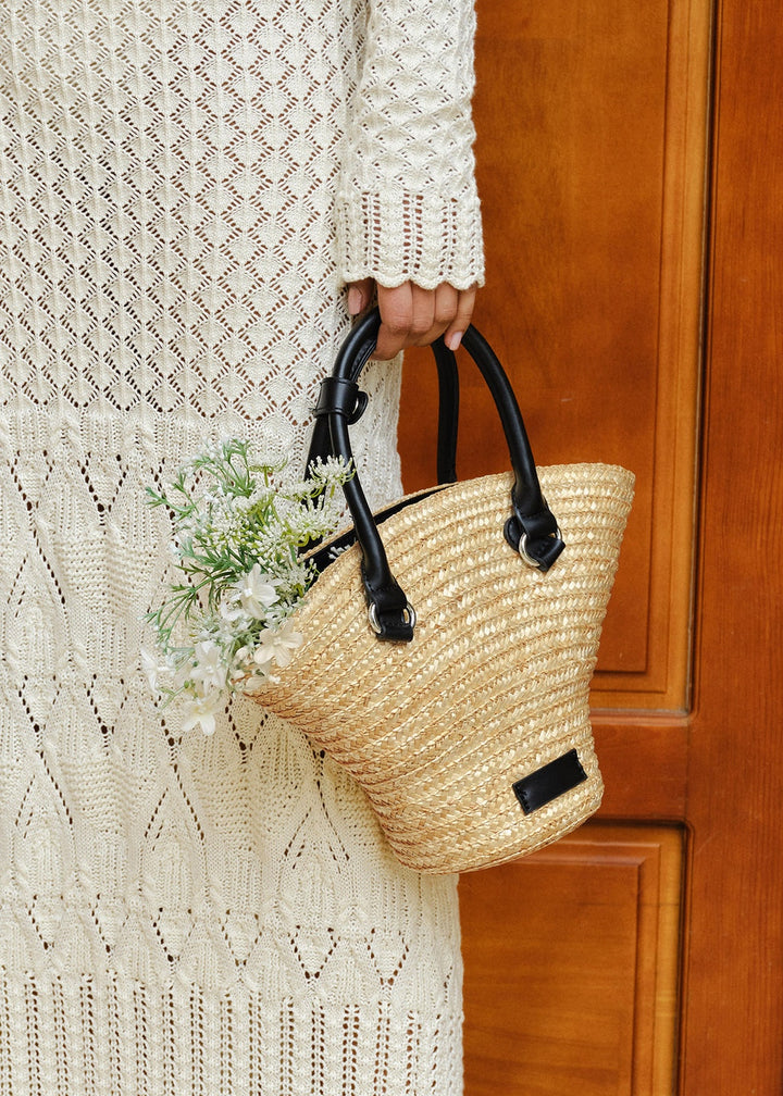 This charming handbag is crafted from a woven straw material, giving it a natural and summery aesthetic. It features two rounded top handles for easy hand carrying, as well as a detachable and adjustable shoulder strap for versatile wear. The bag has a trapezoidal shape with a wide opening at the top. The interior is likely lined, offering a functional space for your belongings. This bag combines the texture of straw with practical design elements, making it a stylish accessory for warm weather.