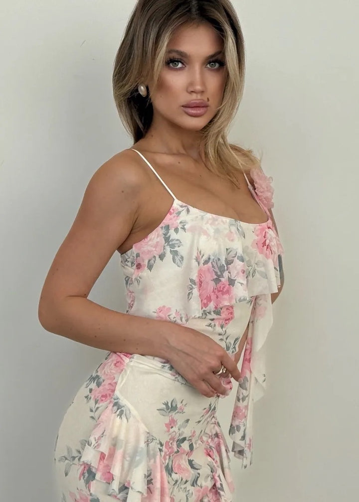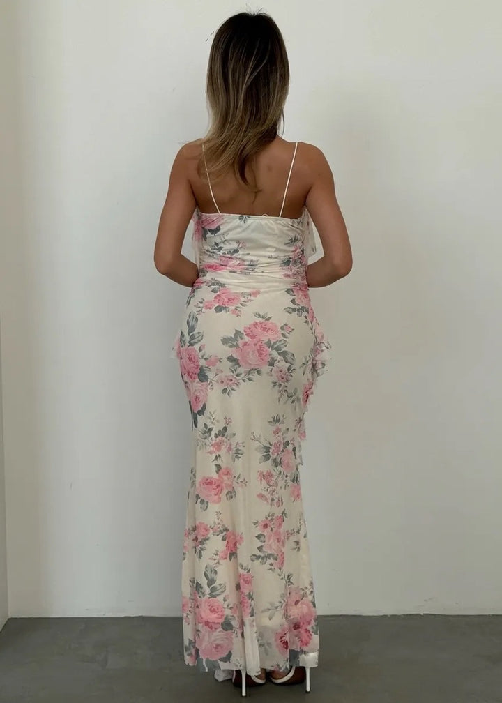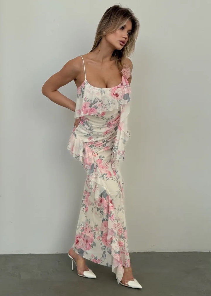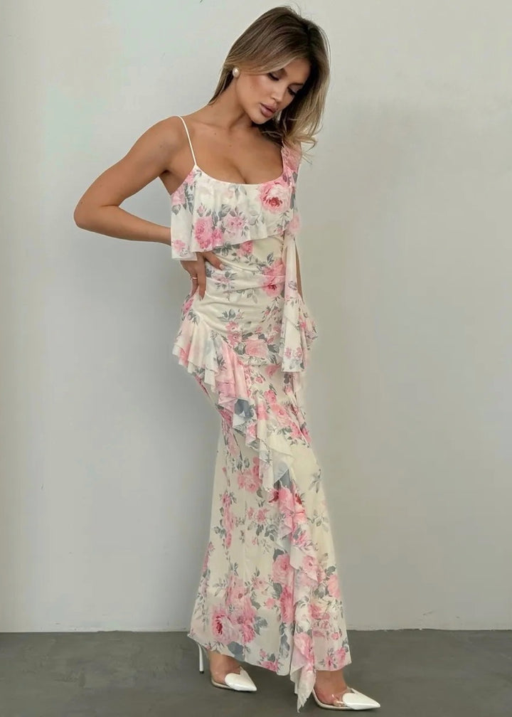 Introducing our Floral Maxi Dress with Ruffle Details and Spaghetti Straps, designed to bring elegance and allure to any occasion.