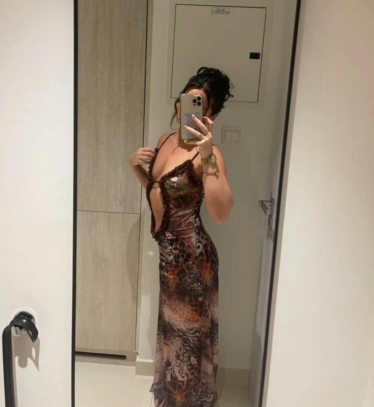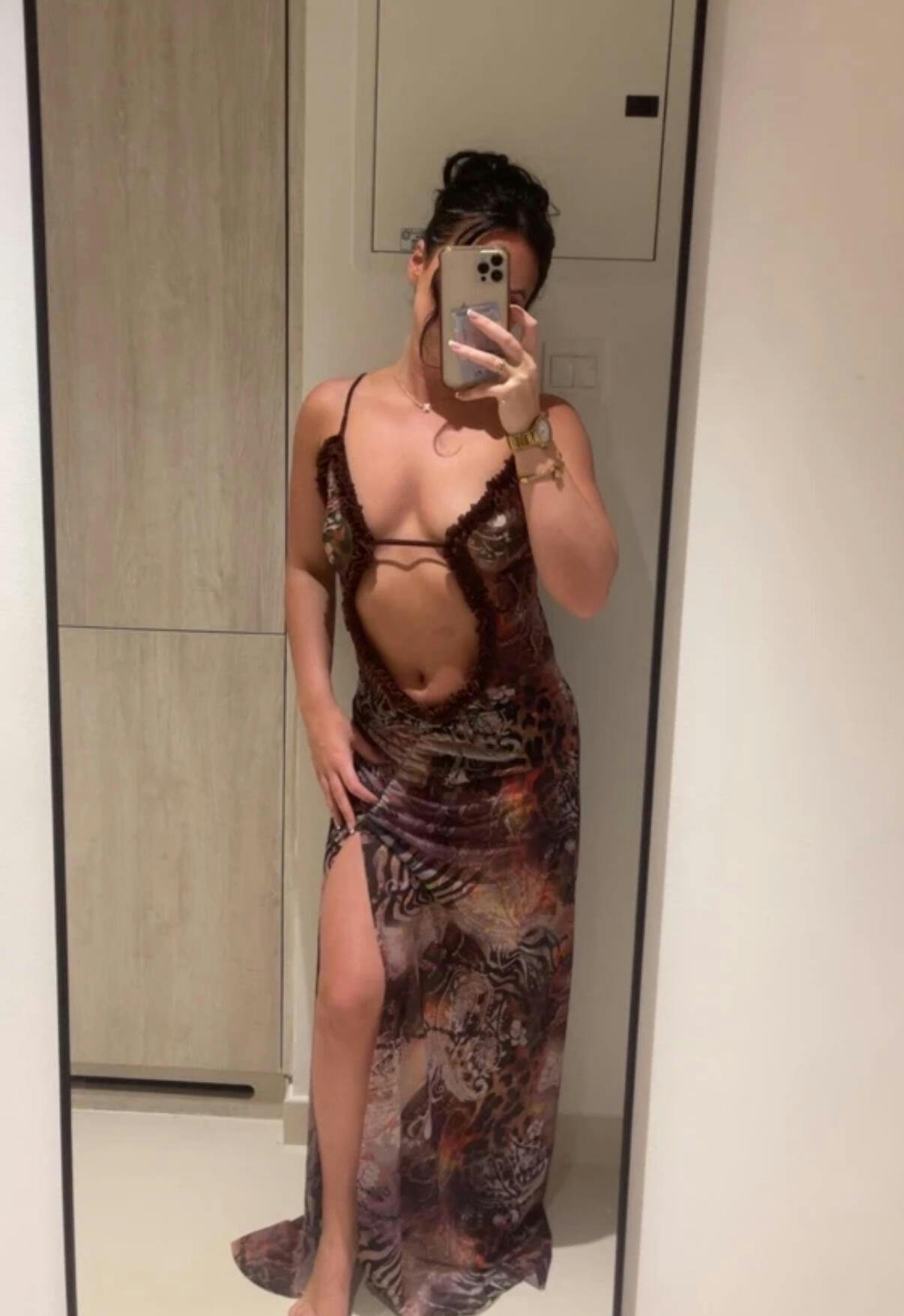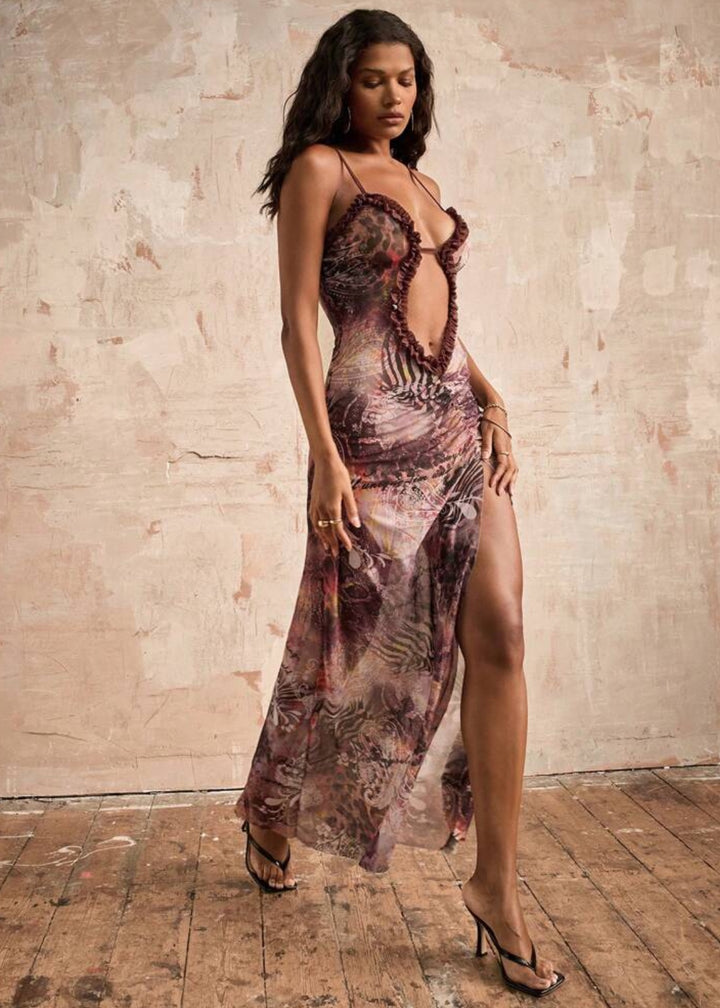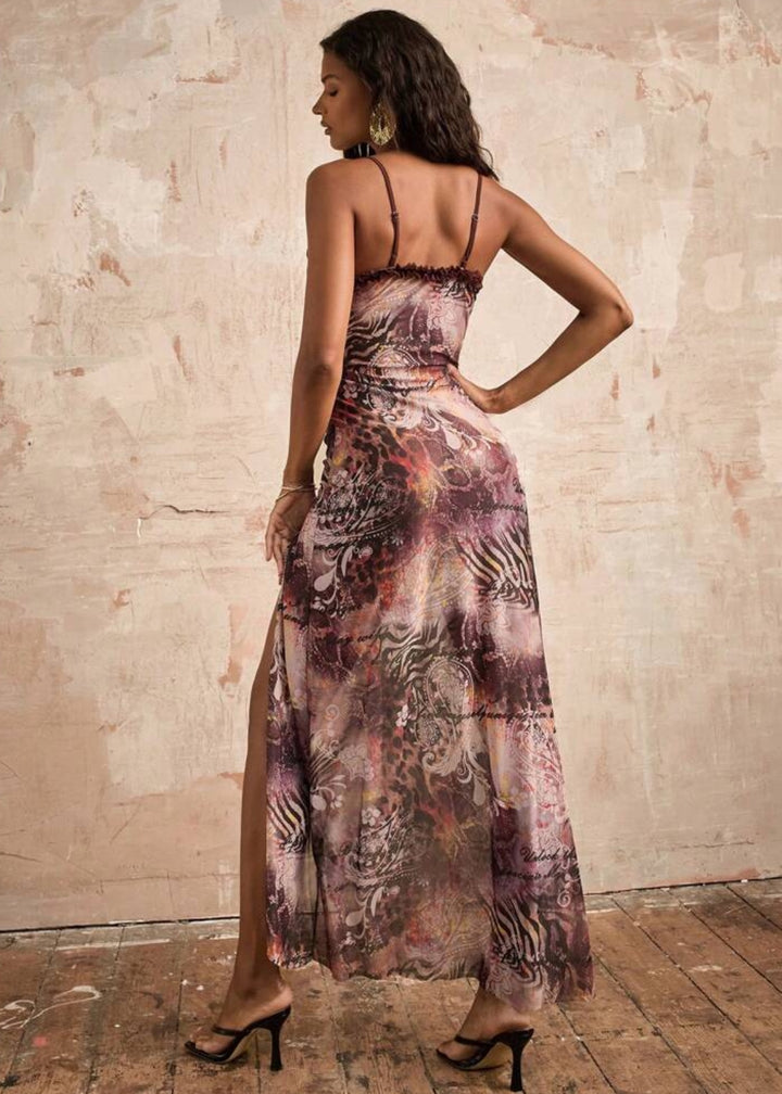 This maxi dress is a striking statement piece, designed to captivate with its bold cut and unique print. It features delicate spaghetti straps and a deep V-neckline, complemented by an alluring midriff cut-out with ruched detailing, adding an intriguing focal point. A high slit along one side offers movement and reveals a glimpse of leg, enhancing its daring appeal. The dress is characterized by an abstract, multi-patterned print throughout, making it a standout garment for any occasion. Its form-fitting silhouette gracefully extends to a maxi length, ensuring a memorable presence.