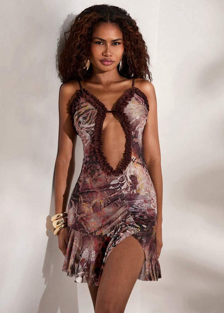 This daring mini dress is a bold statement piece, featuring a captivating mix of edgy design and feminine frills. It showcases delicate spaghetti straps that lead to a deep V-neckline, which plunges to a unique central cutout at the bust, creating an alluring focal point. The dress is defined by its asymmetric hemline with a high side slit, adding a touch of drama and movement. The edges of the neckline, cutout, and hemline are finished with intricate ruffles, providing a playful contrast to the bold silhouette and the all-over abstract print. This dress is perfect for making a memorable entrance at parties, club nights, or any event where you want to showcase a confident and unique style.