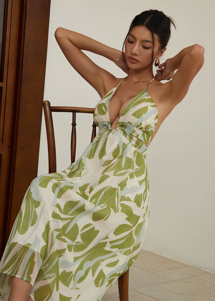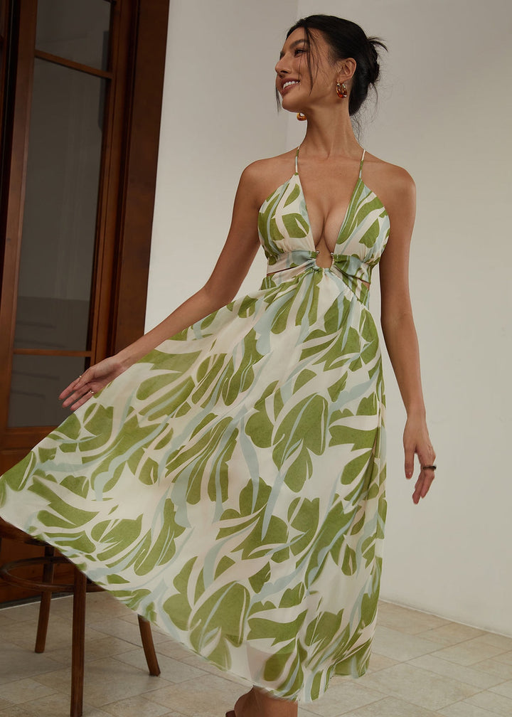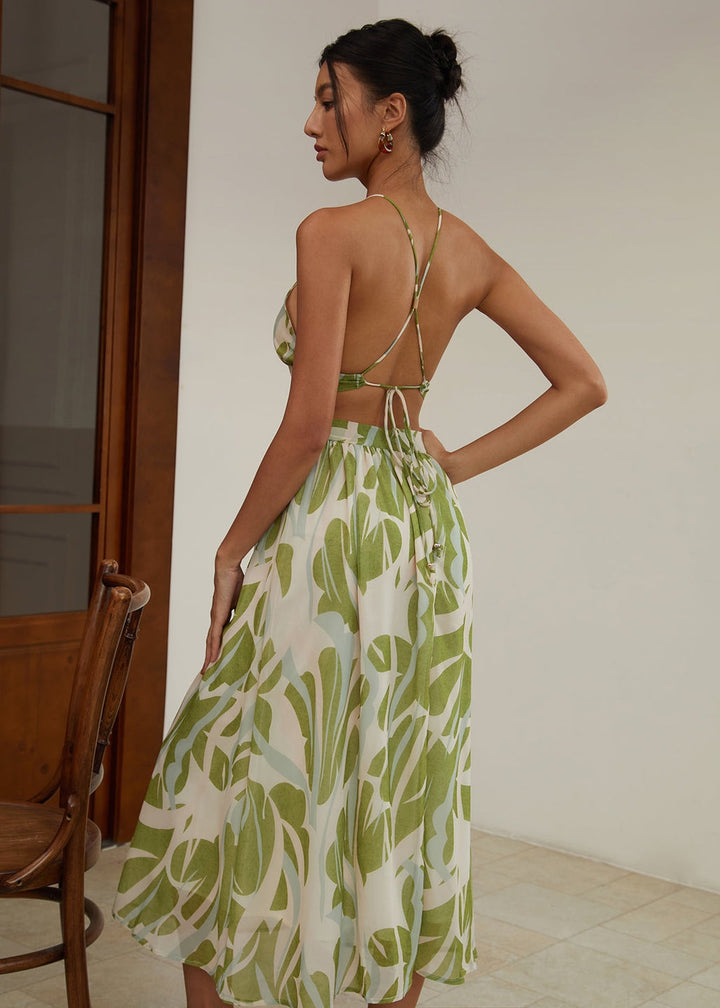 This flowy dress is designed with a deep V-neckline that culminates in a delicate twist detail at the bust. It features a halter style with thin straps that tie at the nape of the neck, and an open back with additional crisscross straps that tie at the lower back, allowing for an adjustable and secure fit. The waist is cinched, leading into a voluminous, midi-length skirt with a graceful high-low hem that sways with movement. The dress is adorned with an all-over abstract leaf pattern, giving it a vibrant and natural aesthetic. Crafted from a lightweight fabric, it's a perfect choice for warm weather.