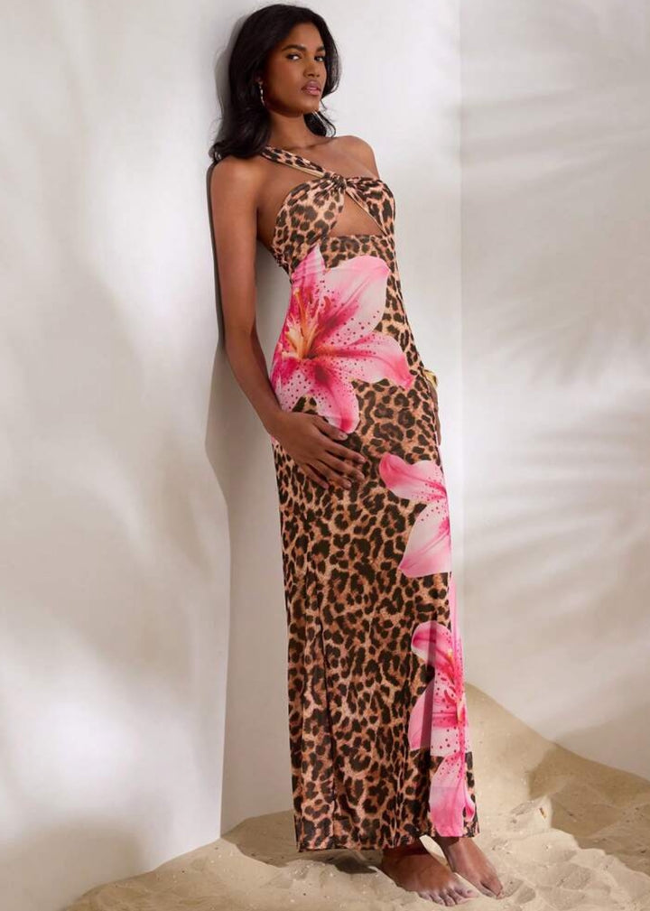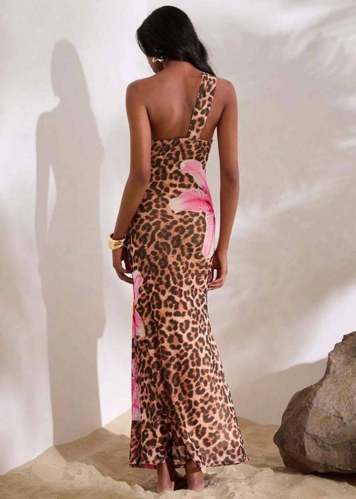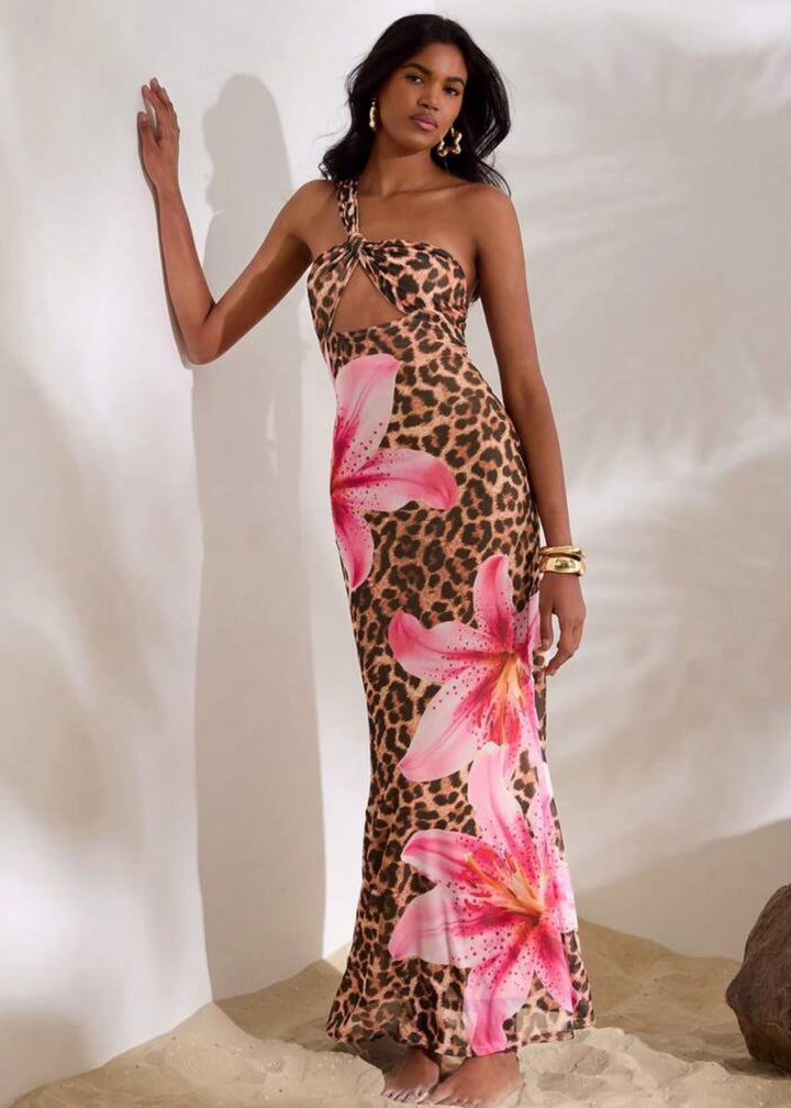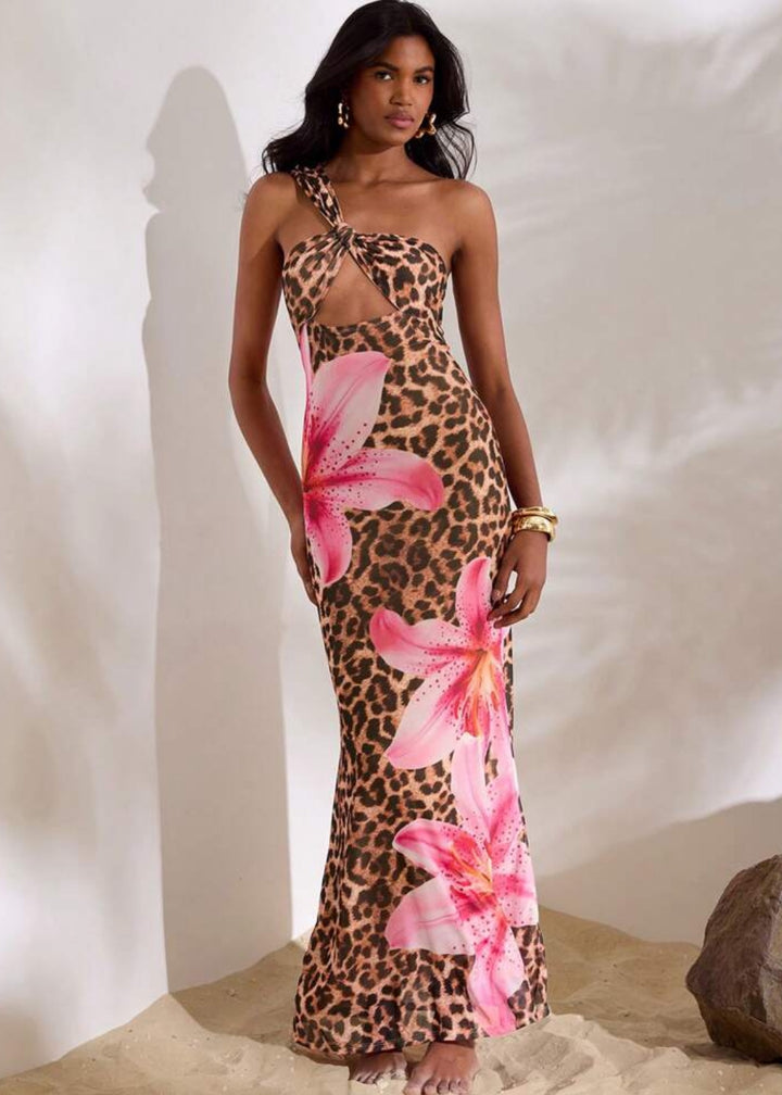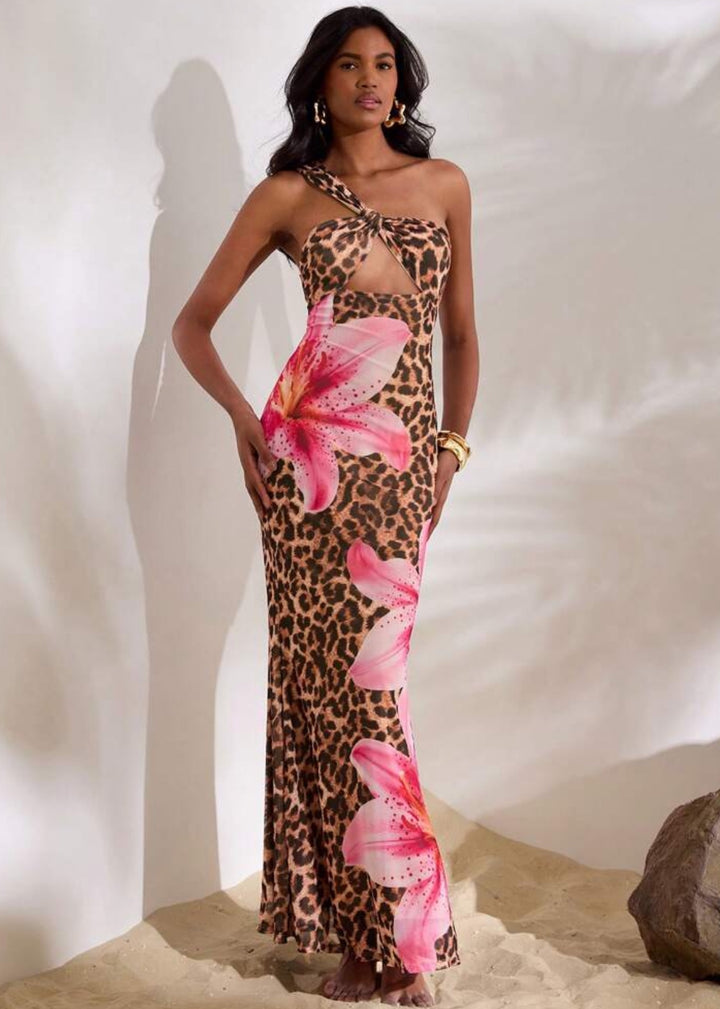 This striking maxi dress masterfully blends bold patterns with an elegant silhouette. It features a unique one-shoulder neckline with a stylish knot detail that creates a subtle cutout at the bust. The dress is adorned with a captivating combination of a classic animal print as its base and strategically placed large floral motifs that add a vibrant and contrasting element to the design. The fitted bodice flows seamlessly into a floor-length skirt, creating a sophisticated and head-turning look. This dress is a perfect choice for evening events, special occasions, or any time you want to make a fashionable statement.