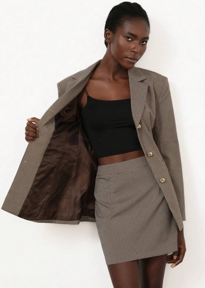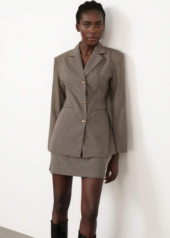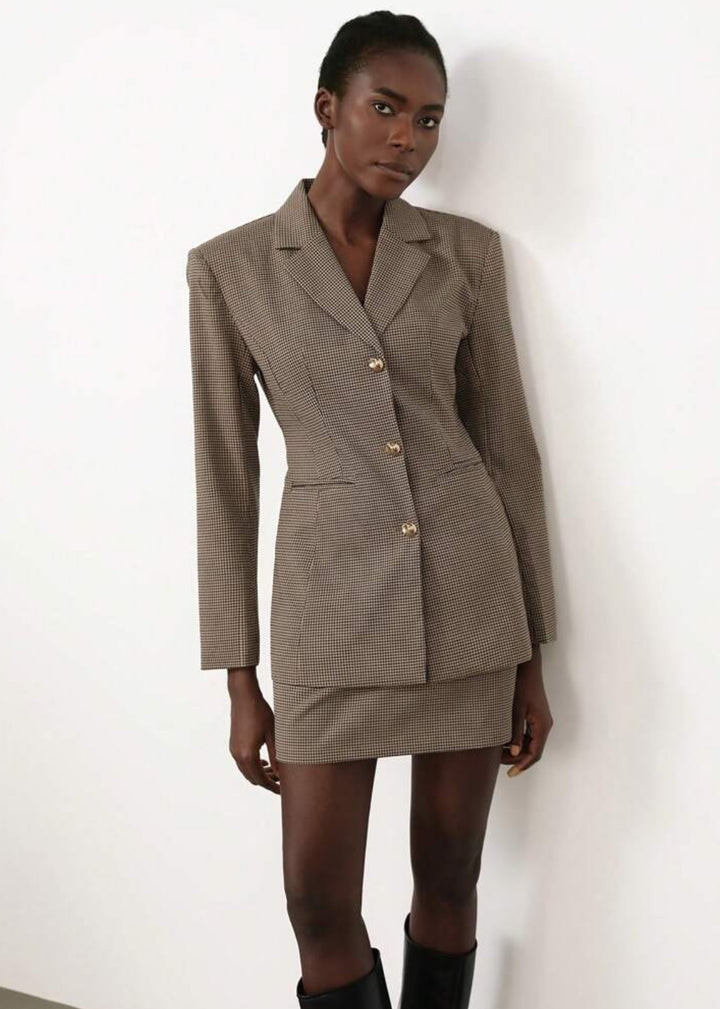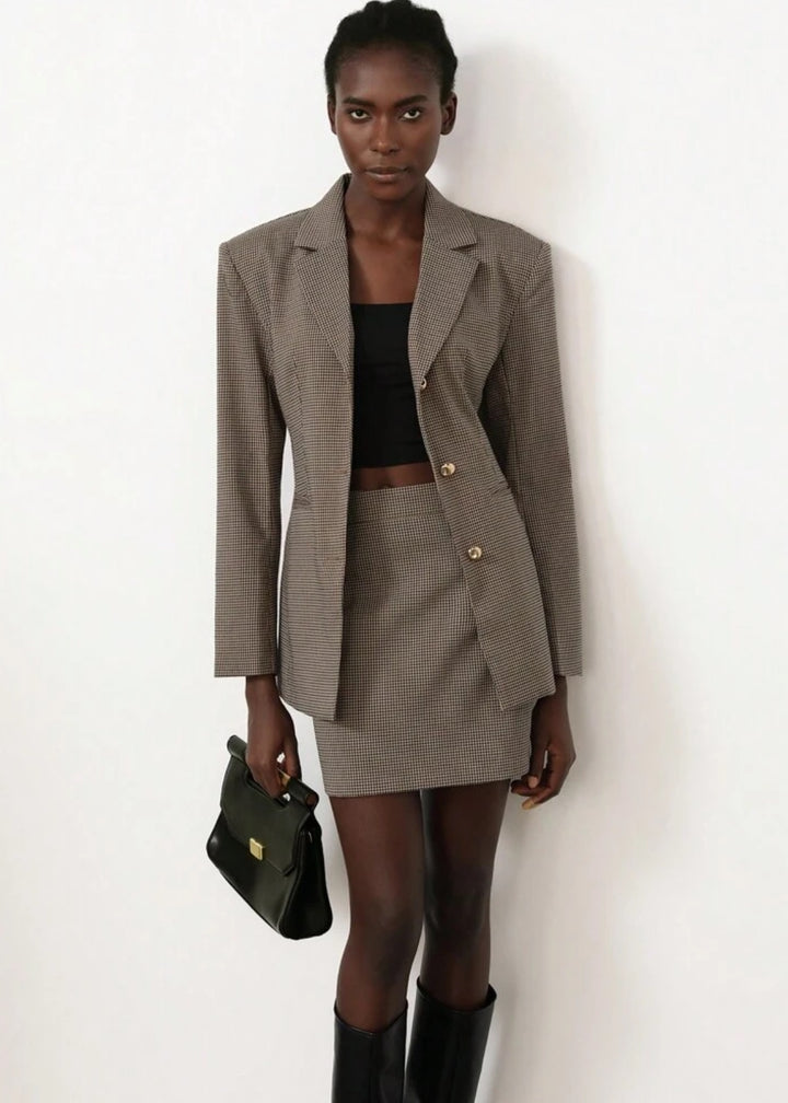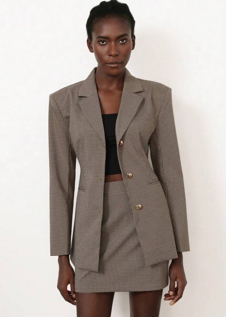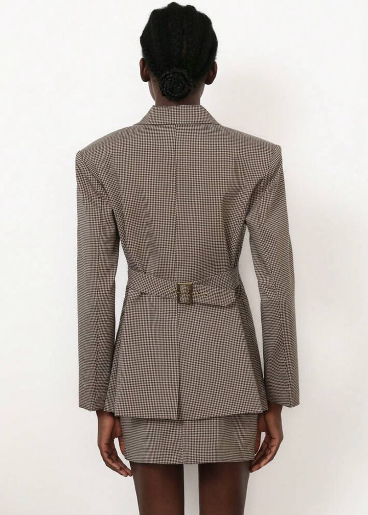This tailored blazer features a sophisticated plaid pattern and peak lapels, giving it a sharp, professional look. It includes a back waist belt with a buckle for an adjustable and flattering fit. The structured shoulders add a powerful touch, making this blazer ideal for both office wear and polished casual ensembles.