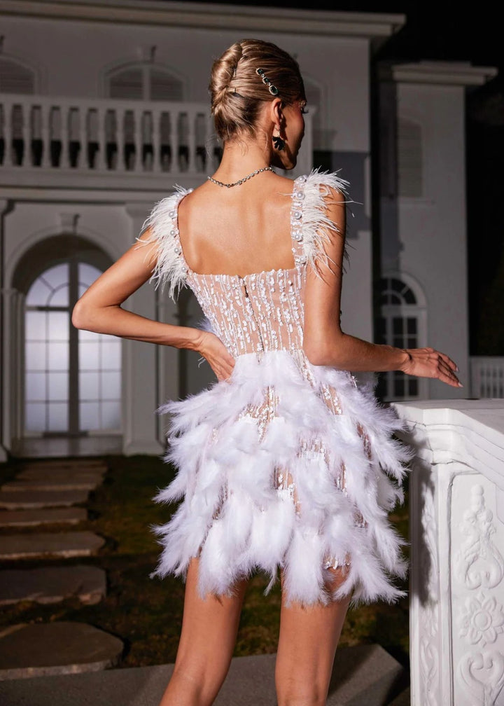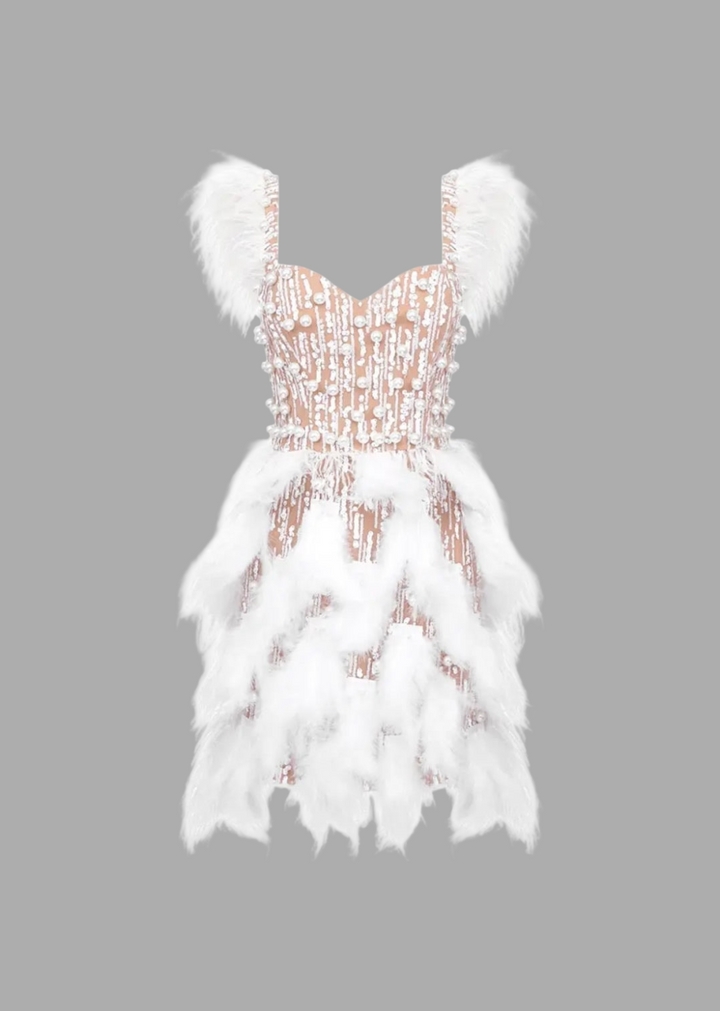 This playful mini dress features a square neckline and thick straps adorned with delicate pearl and bead embellishments. The bodice is intricately detailed with pearls and shimmering accents. The skirt is dramatically covered in layers of soft feathers, creating a voluminous and dynamic silhouette. Feather detailing also extends to the shoulder straps, completing this unique and celebratory design.