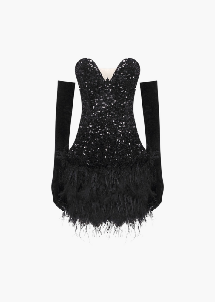 This alluring mini dress and glove set is designed to make a statement. The dress features a strapless sweetheart neckline with a subtle mesh insert at the bust and a body adorned with shimmering sequins. The hemline is playfully decorated with layers of feathers, adding movement and glamour. A hidden back zipper ensures a smooth fit. Complementing the dress are long, stretch gloves, creating a cohesive and sophisticated ensemble perfect for cocktail parties, New Year's Eve celebrations, or any festive occasion requiring a touch of sparkle.