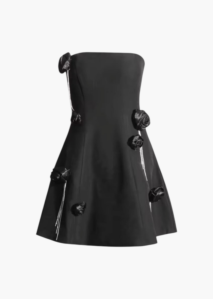 This dress offers a modern take on a classic silhouette with its structured design and whimsical details. It features a strapless bodice and a flared mini skirt that creates a playful, A-line shape. The key details are the three-dimensional rose appliqués that cascade down the front of the dress, accompanied by delicate chains of rhinestones for a touch of sparkle. A hidden zip closure on the back ensures a smooth, seamless fit.
