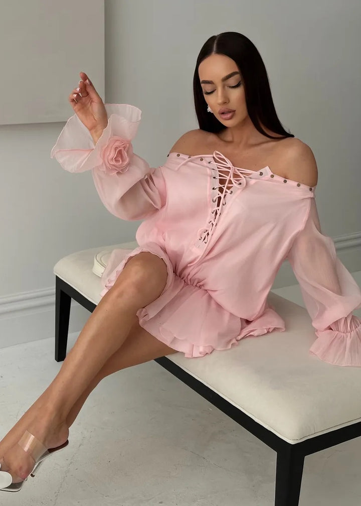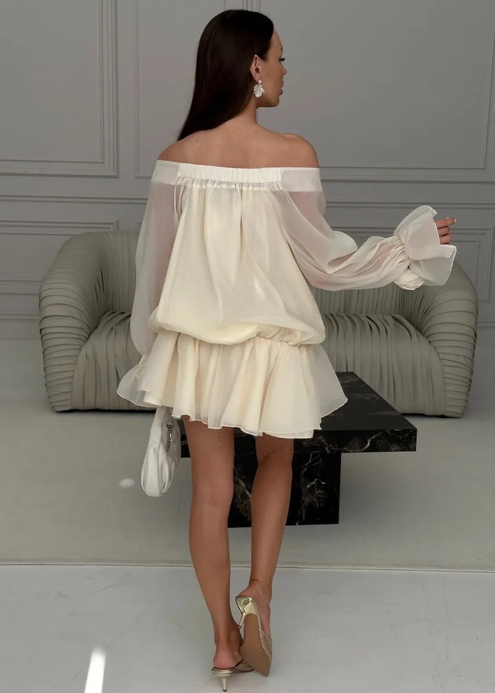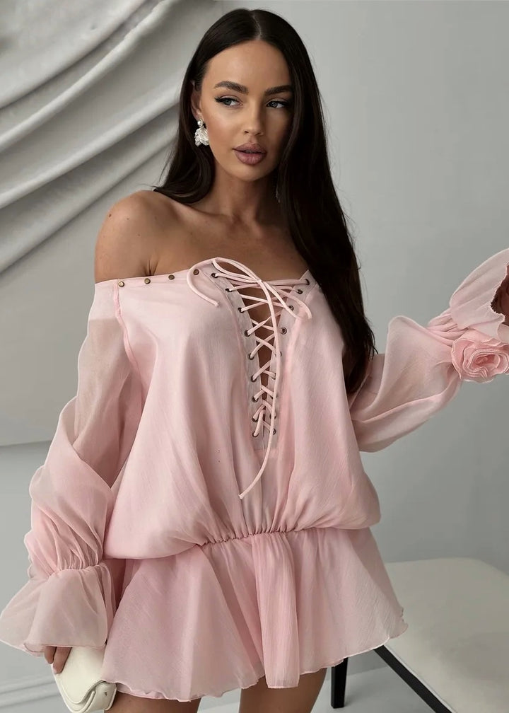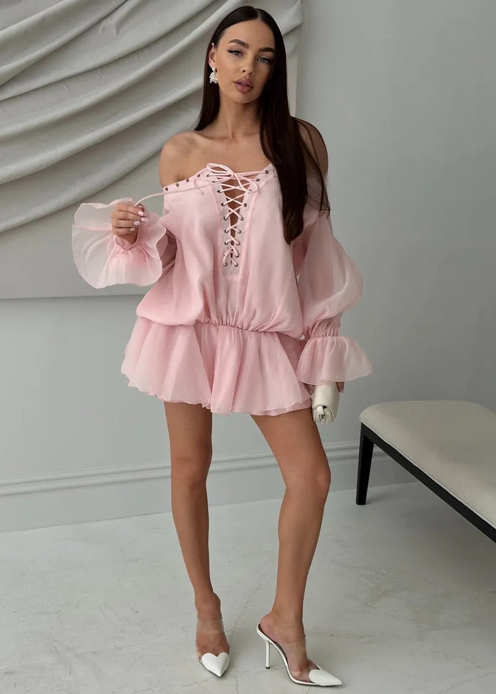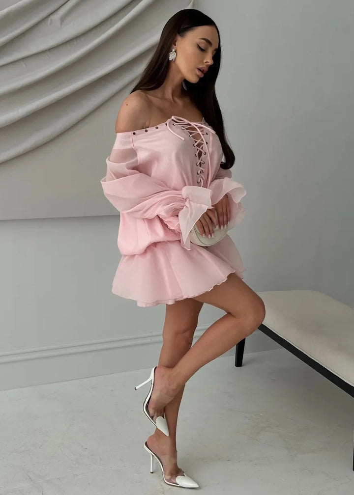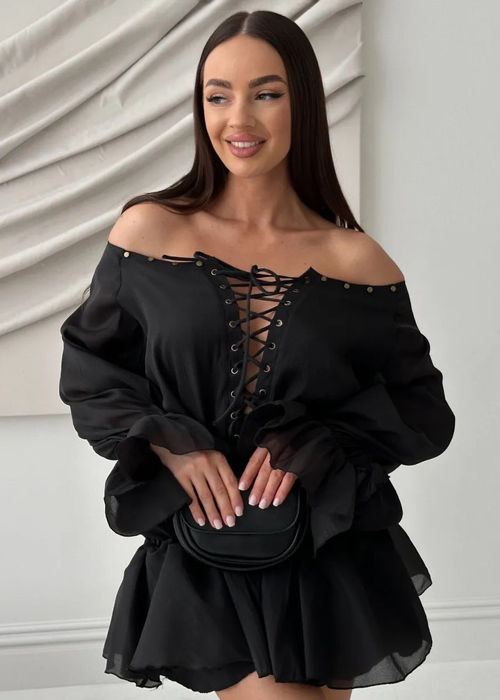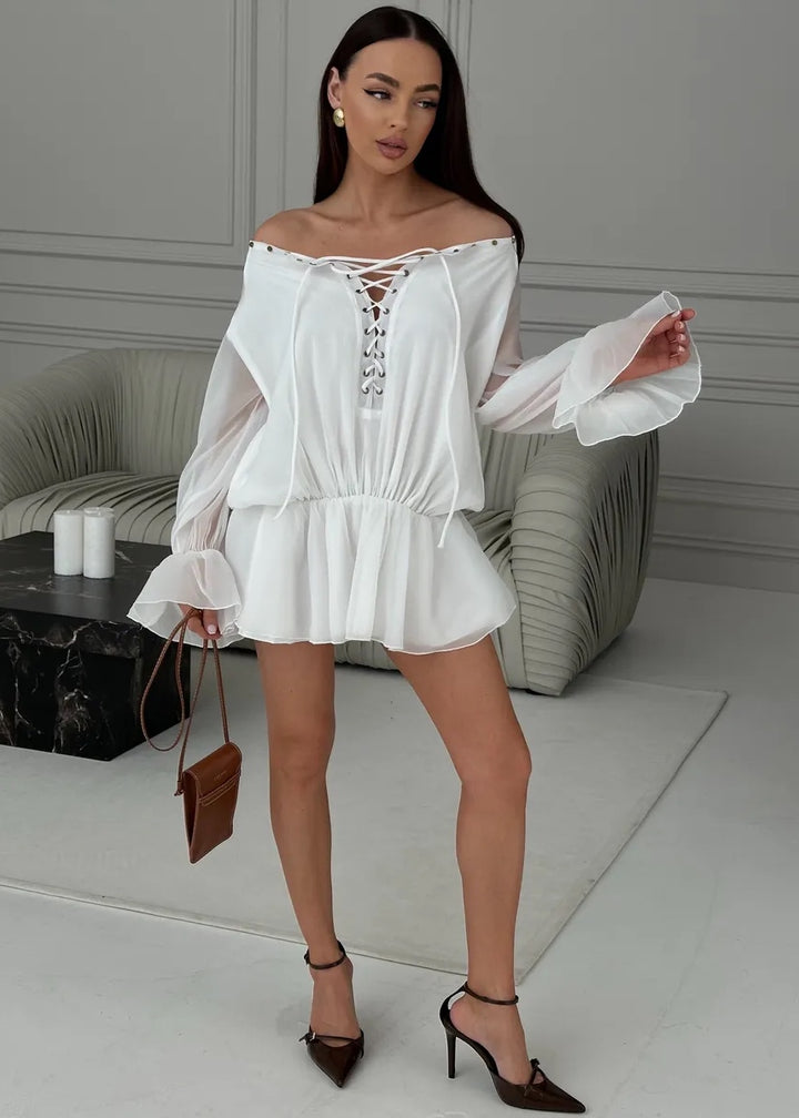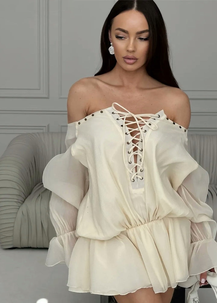 Discover the charm of our Laced Off-Shoulder Ruffled Mini Dress, featuring a unique blend of playful and sophisticated elements. This dress showcases an off-shoulder design with a delicate lace-up front, accentuated by ruffled sleeves and a flared hem.