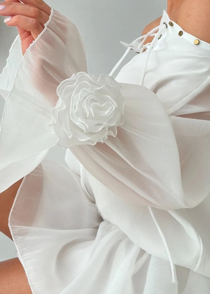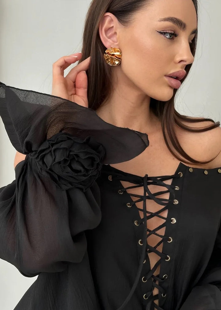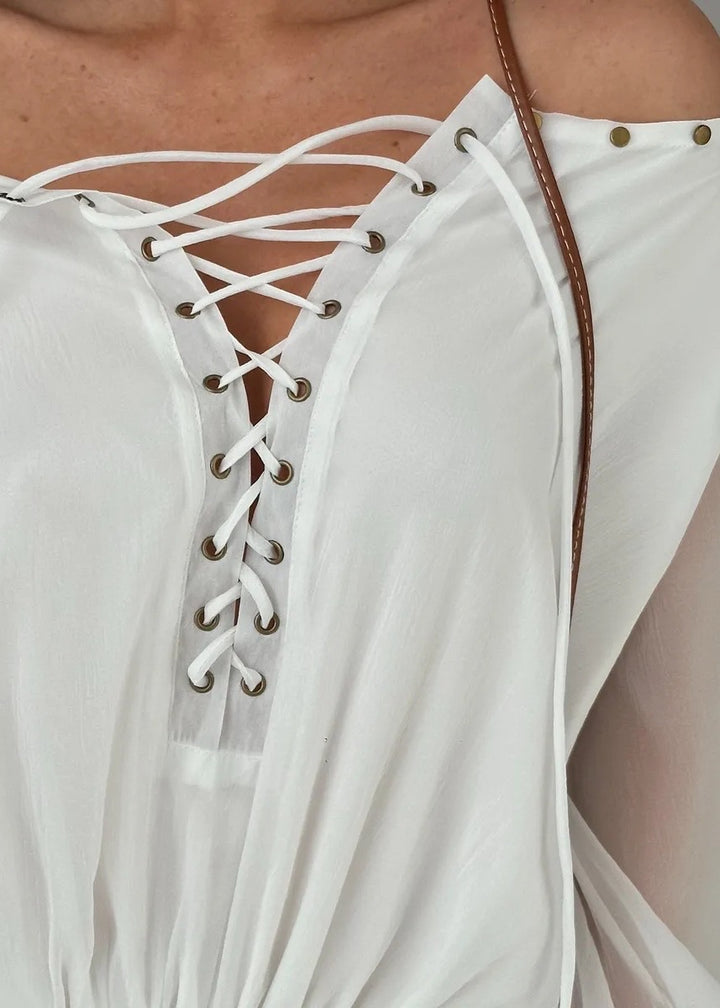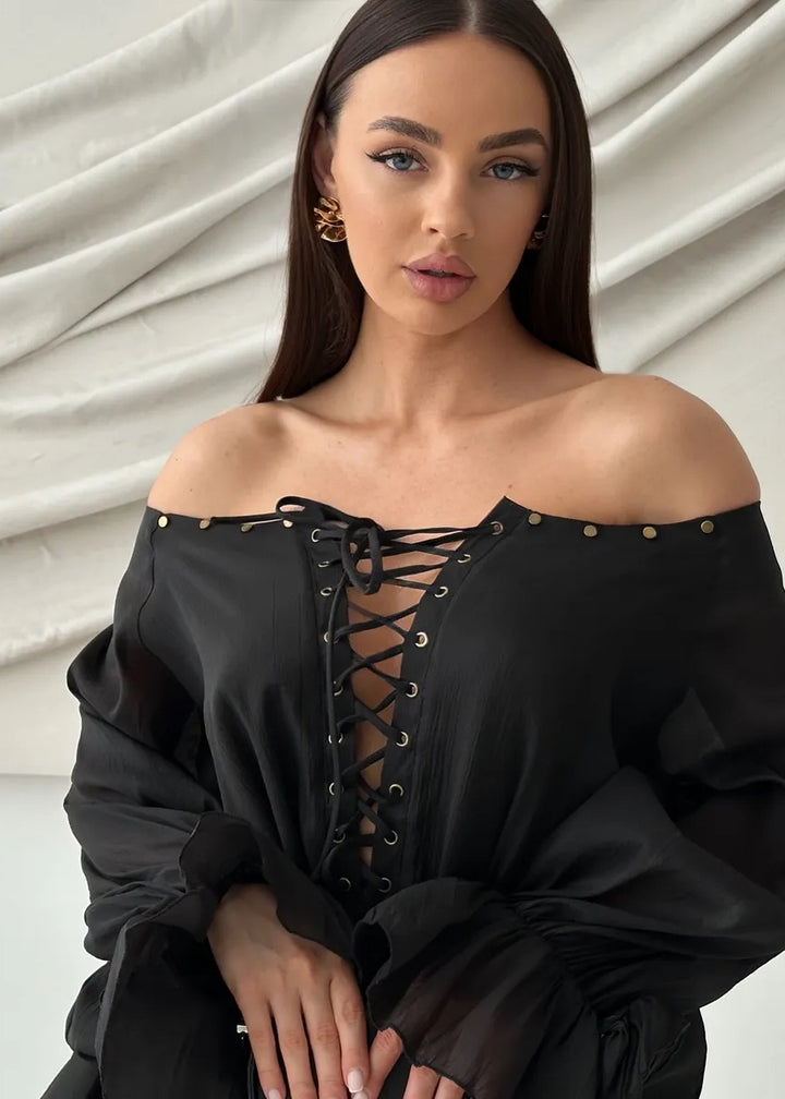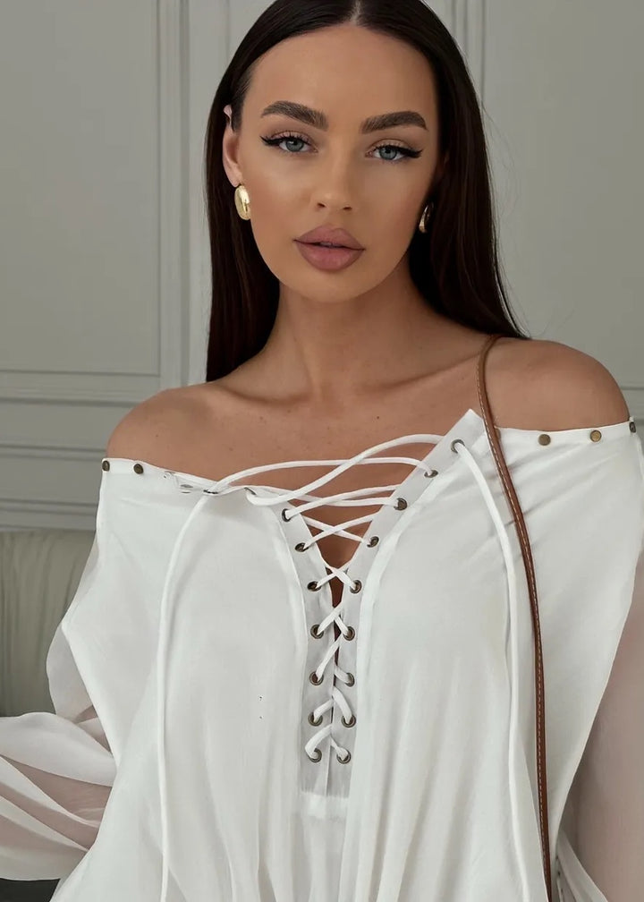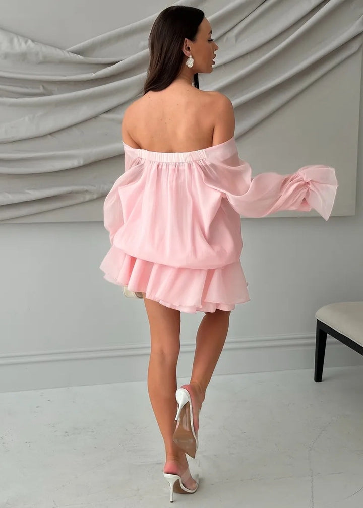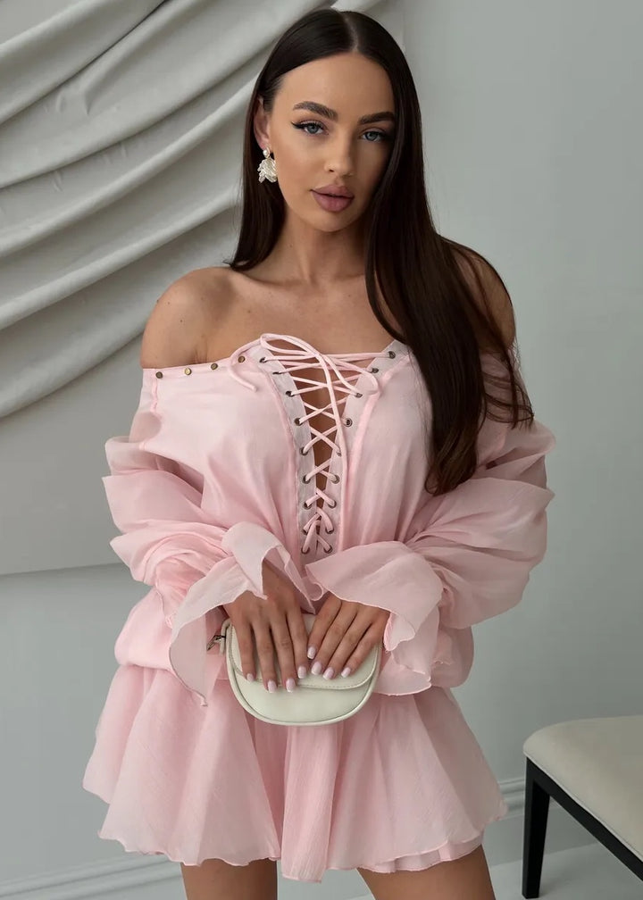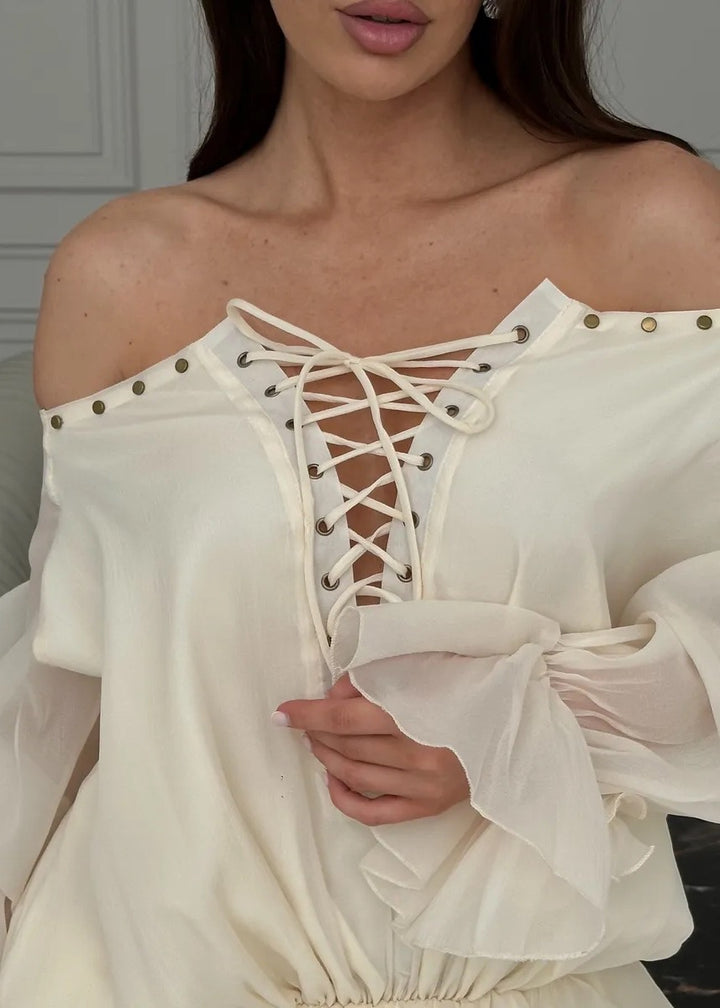 Discover the charm of our Laced Off-Shoulder Ruffled Mini Dress, featuring a unique blend of playful and sophisticated elements. This dress showcases an off-shoulder design with a delicate lace-up front, accentuated by ruffled sleeves and a flared hem.