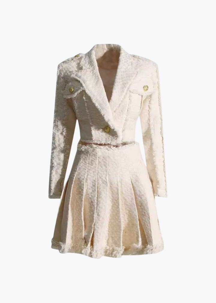 This two-piece set is a sophisticated and textured ensemble, perfect for a chic and polished look. The set features a cropped jacket and a matching mini skirt, both crafted from a unique, textured bouclé-like fabric. The jacket has a tailored silhouette with a structured collar and prominent gold-tone buttons on the shoulders and cuffs. Its design includes an inverted pleat detail at the waist for a cinched effect and a deep V-neckline. The mini skirt complements the jacket with a high waist and a pleated, A-line shape that flares out gracefully. Both pieces are finished with a raw, fringed trim along the hems and seams, adding a touch of deconstructed elegance to the classic silhouette.