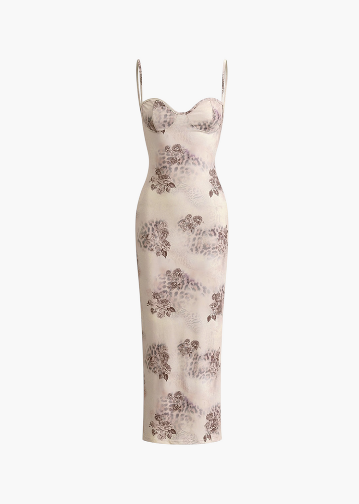 This alluring maxi dress features a delicate and semi-sheer fabric adorned with a blended animal and floral print. It has thin, adjustable spaghetti straps and a sweetheart neckline, offering a subtle and feminine touch. The dress has a fitted silhouette that gently skims the body, falling to a midi length with a small slit at the back for ease of movement.