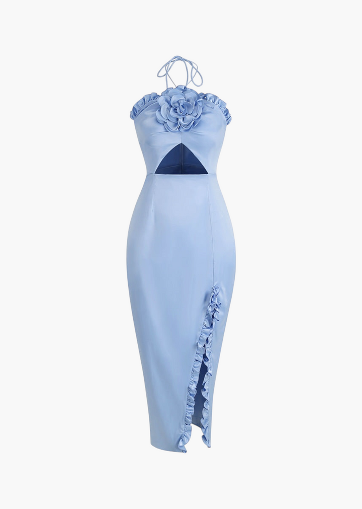 This midi dress combines playful ruffles with a sleek silhouette. It features a ruffled halter neck that ties at the back, creating a large, dimensional floral-inspired detail at the bust. The torso includes a cutout just below the bust, leading into a fitted skirt with ruffled side ruching and a slit. This dress is a standout choice for summer events or parties.