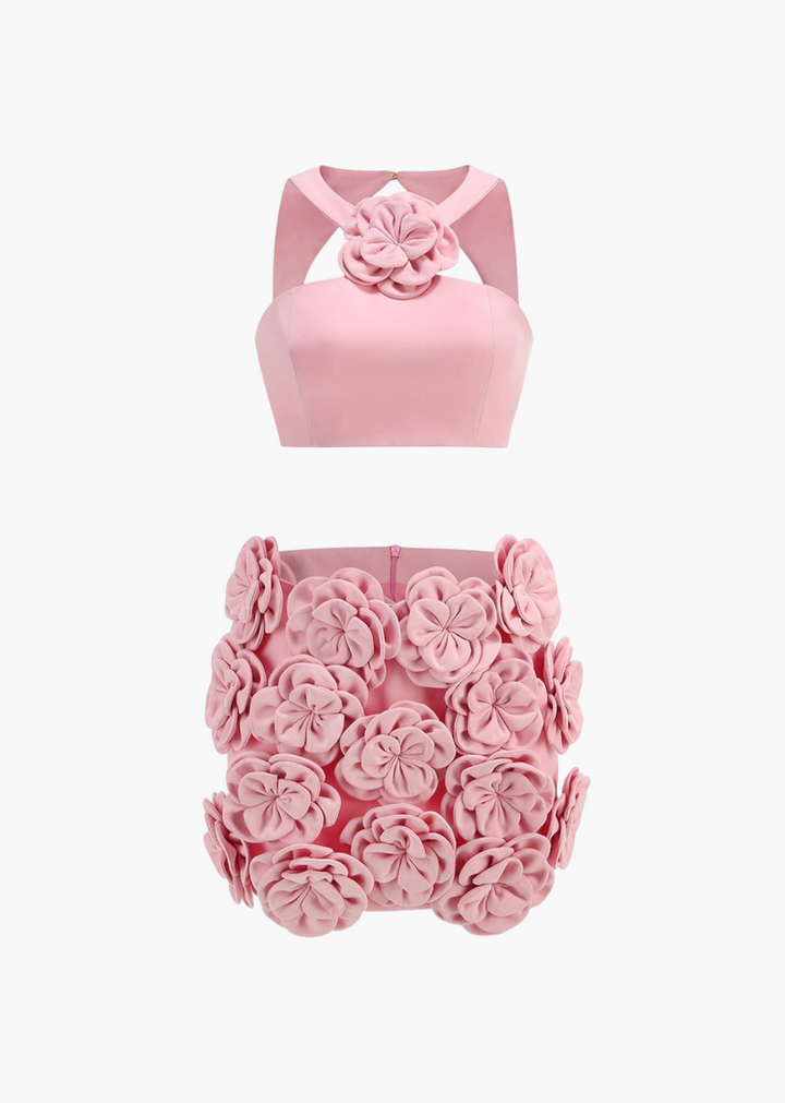 This two-piece set is designed with a cropped halter top that features a single, large floral appliqué at the neckline and a smocked back for a comfortable fit. The coordinating mini skirt is adorned with multiple three-dimensional floral appliqués across the front and has a zipper closure at the back.