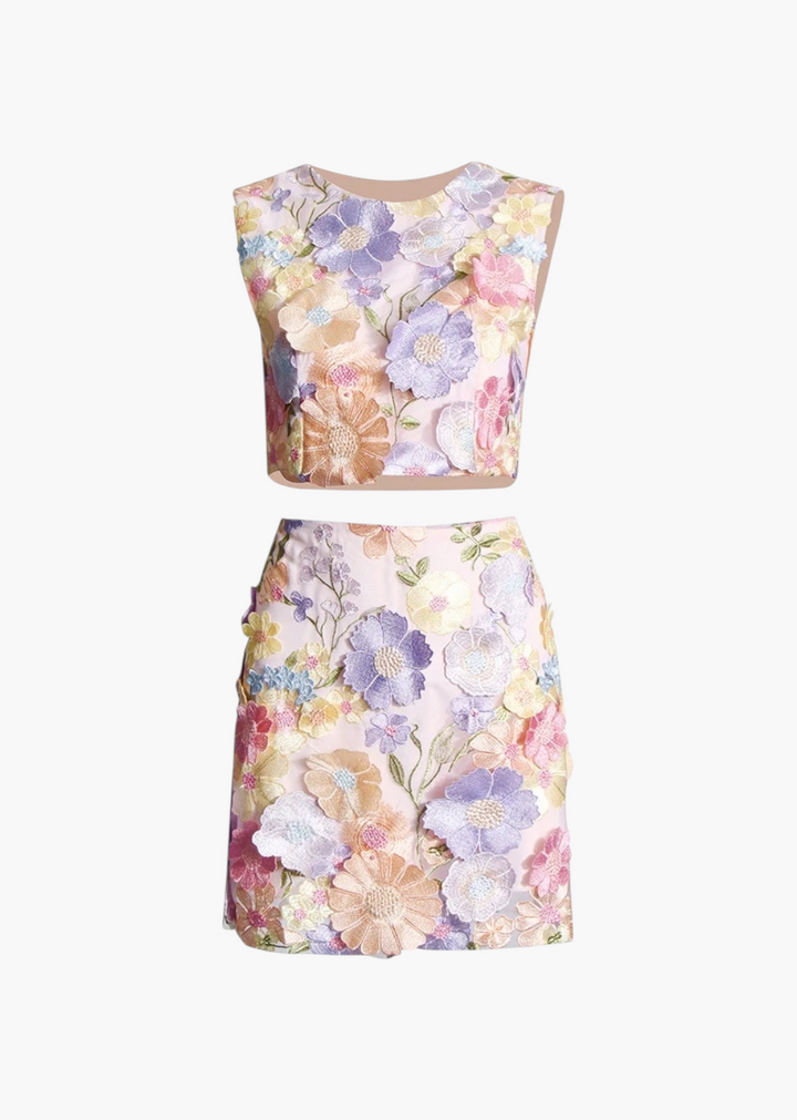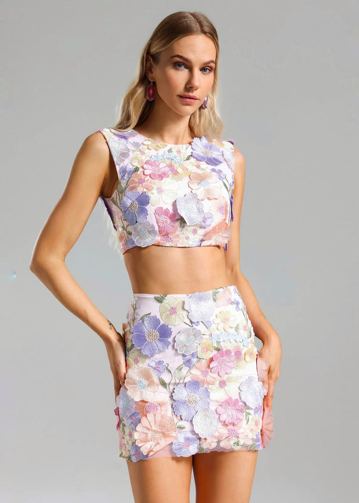 This charming two-piece set features a sleeveless crop top and a matching mini skirt, both adorned with three-dimensional floral appliques. The top has a crew neckline and a zipper closure at the back, while the skirt has a short hemline with layered fabric details. The entire set is embellished with intricate embroidery.