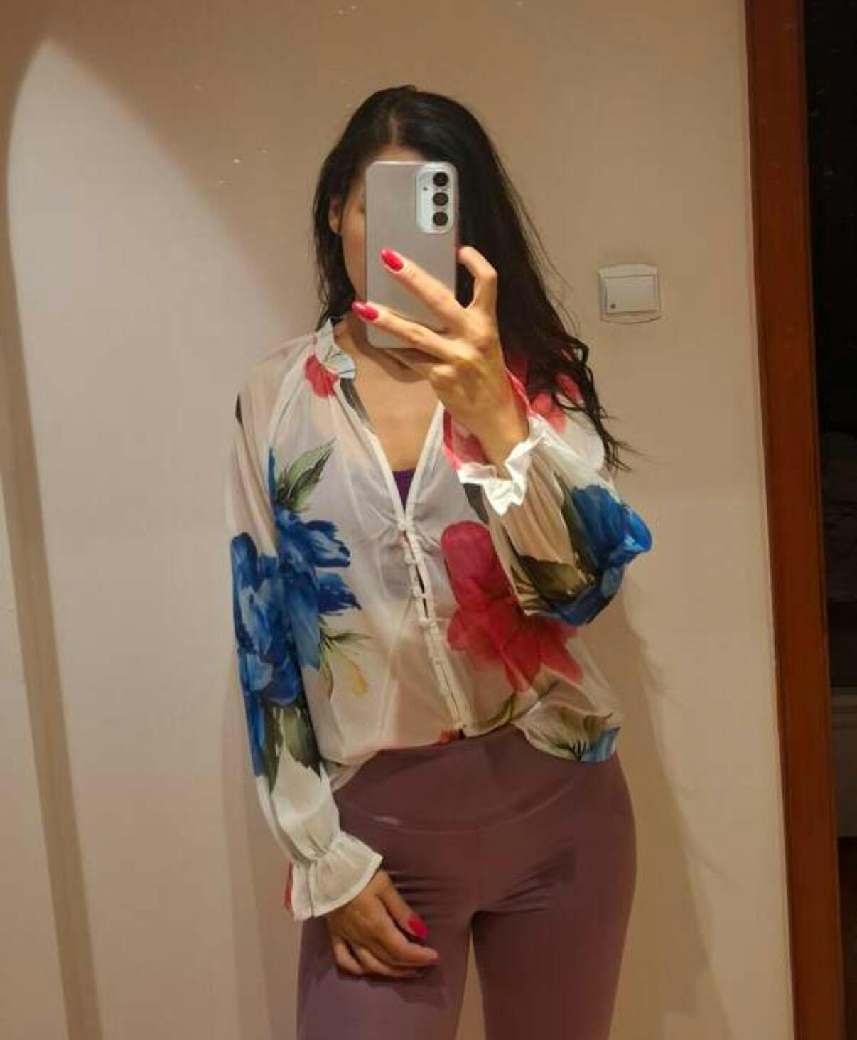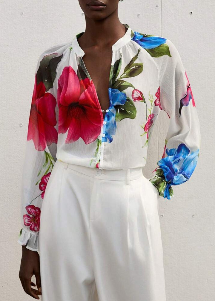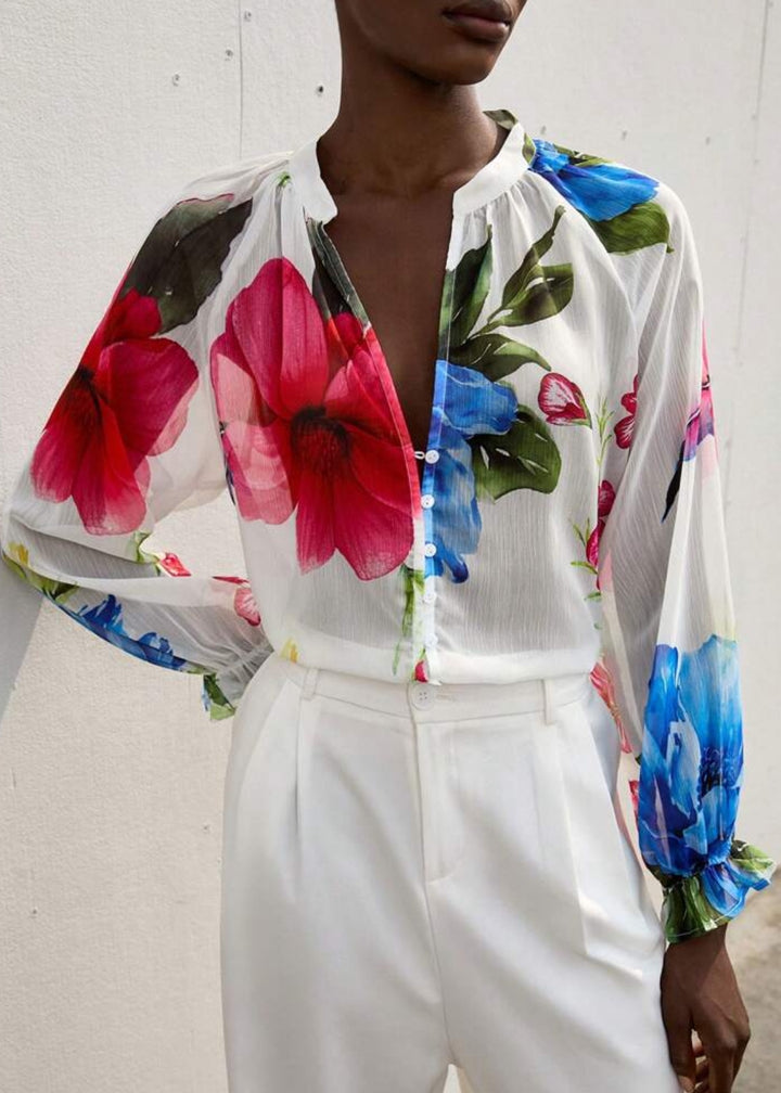 Pair this blouse with high-waisted jeans and ankle boots for a chic daytime look. For a night out, tuck it into a tailored skirt and add statement earrings. Layer it over a fitted tank top for added coverage while still showing off the beautiful floral design.