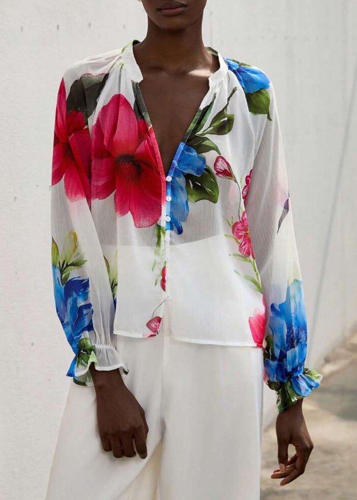 This lightweight blouse features a delicate, sheer fabric adorned with vibrant floral patterns, making it a perfect choice for any occasion. The relaxed fit and button-up closure offer versatility, allowing you to style it effortlessly for both casual and dressy looks.
