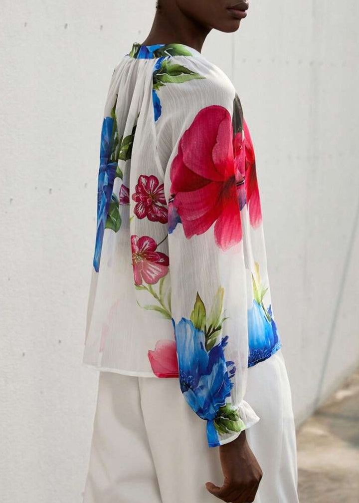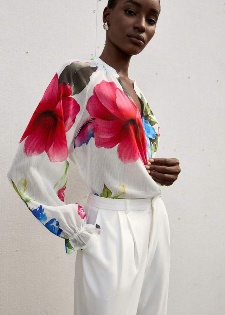 To maintain the quality of this blouse, hand wash cold and lay flat to dry. Avoid bleach and ironing directly on the print to preserve the vibrant colors.