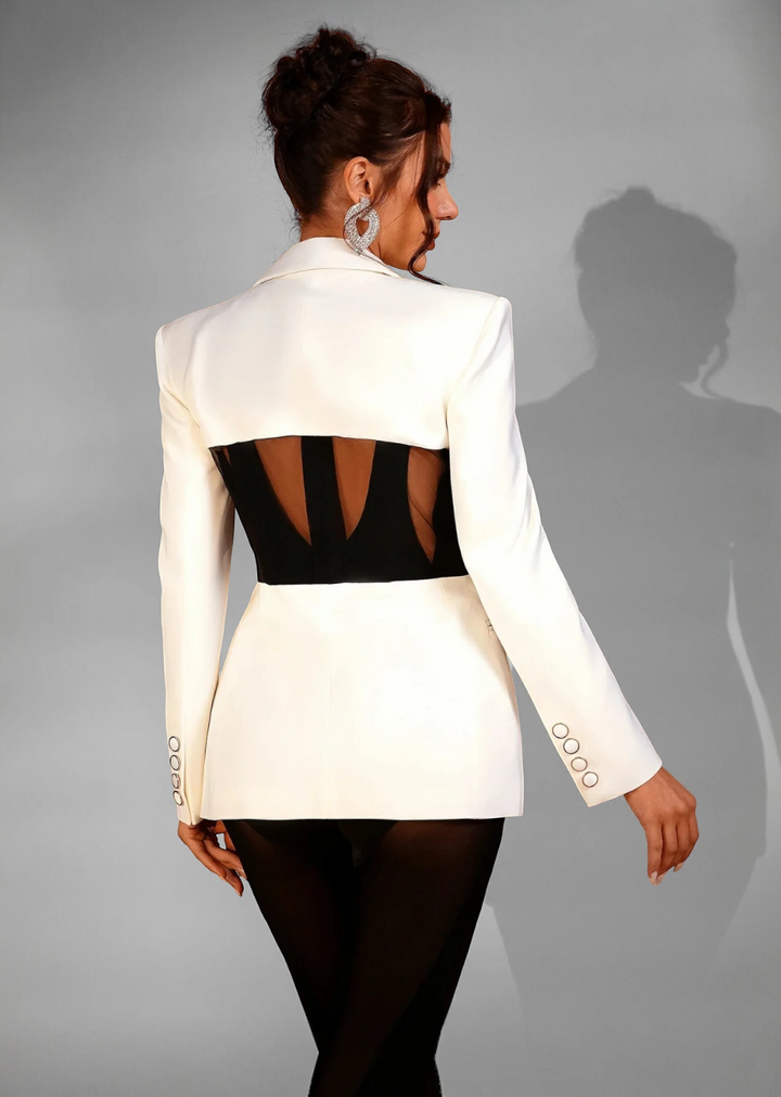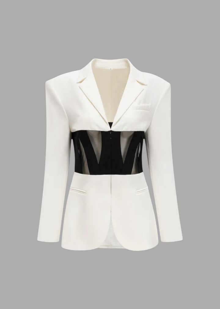 This blazer is a daring and sophisticated piece that redefines power dressing. It features a classic notched lapel and a structured silhouette with long sleeves adorned with decorative buttons at the cuffs. The defining element is the mesh panel corset-style waist that cuts across the midsection, creating a striking contrast and a cinched, flattering fit. This blazer is designed to make a bold fashion statement, perfect for evening events or a modern, edgy professional look.