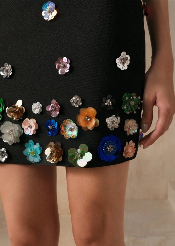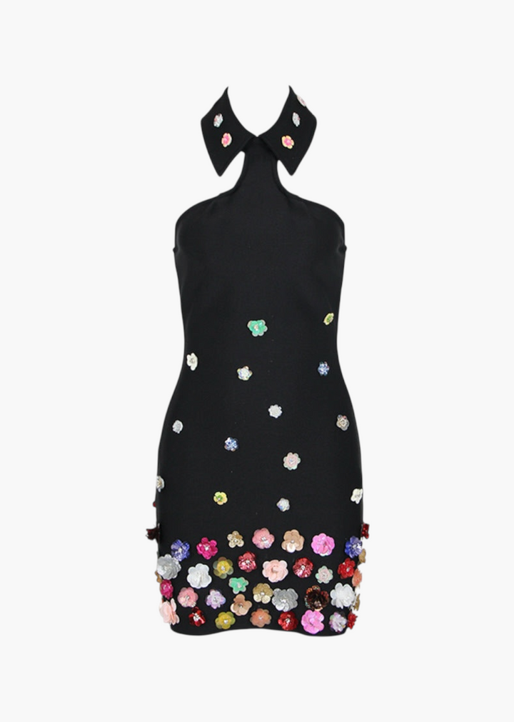 This mini dress features a unique halter neckline with a structured collar. The bodycon silhouette is adorned with three-dimensional floral embellishments of various shapes and sizes. The hemline is decorated with a dense arrangement of the same floral details. A concealed back zipper allows for a smooth, fitted look.