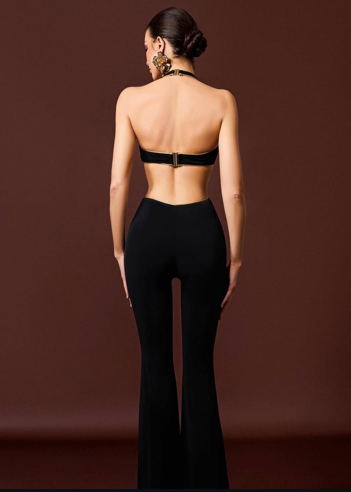 This jumpsuit is a striking and contemporary alternative to a traditional gown, perfect for making a sophisticated statement. The garment features a halter neckline with a captivating keyhole cutout at the bust, which is accented by a three-dimensional rose appliqué. The fitted bodice transitions into daring waist cutouts, adding an element of modern allure. The jumpsuit's bottoms are tailored with a flared pant leg, creating a sleek and elongated silhouette. The back of the jumpsuit is designed with a simple clasp closure at the neck and a discreet zipper at the waist, ensuring a secure and streamlined fit. This piece is an excellent choice for a cocktail party, a formal dinner, or an artistic event.