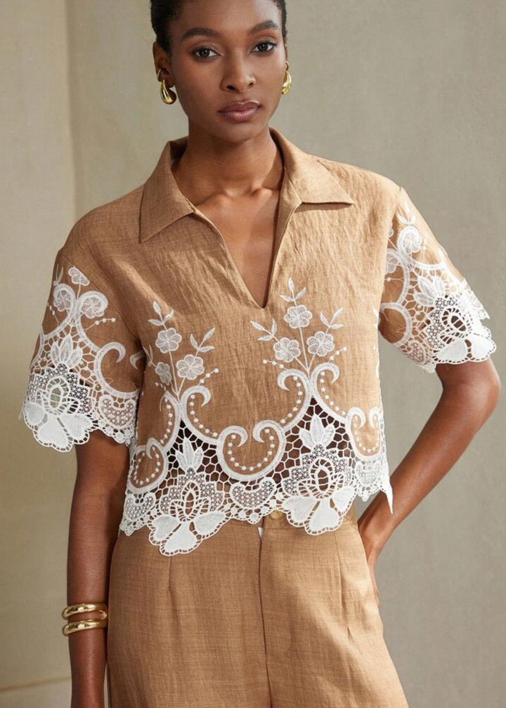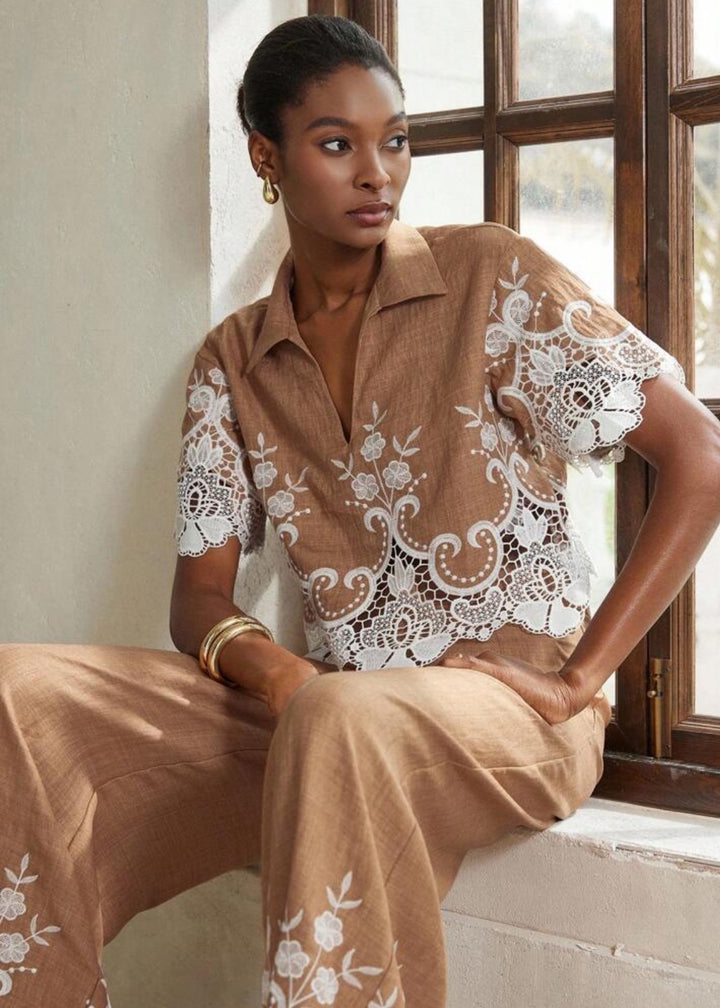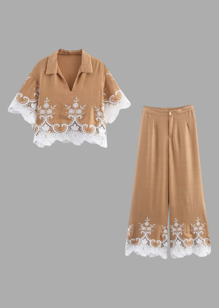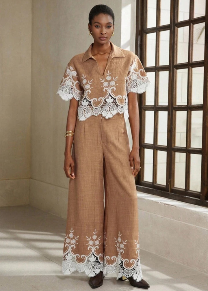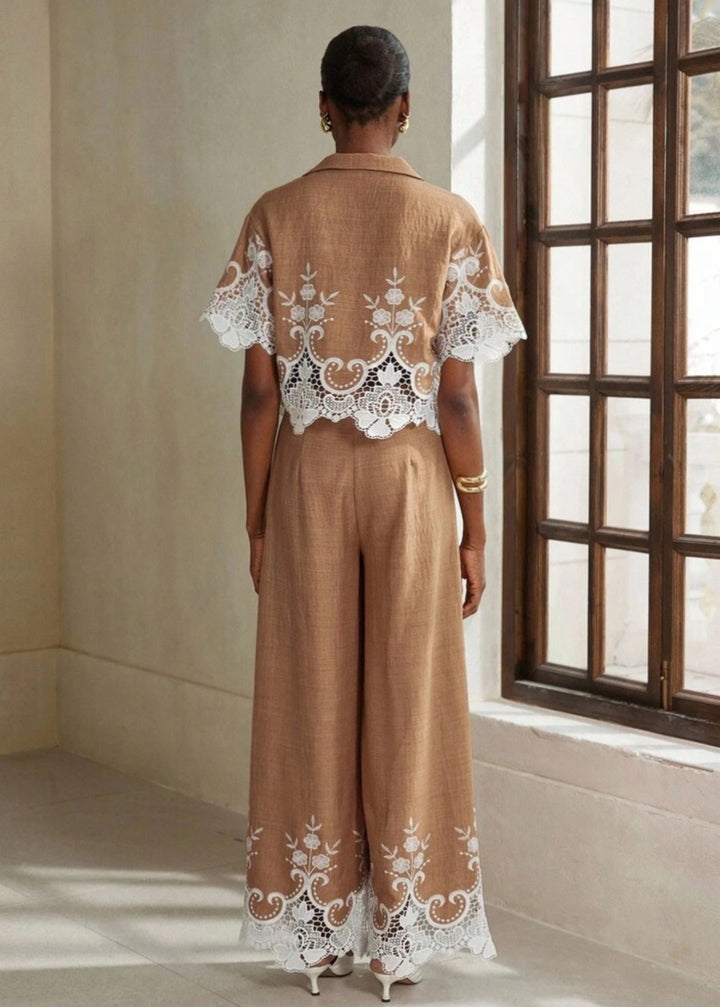 This two-piece set features a relaxed camp collar top with a V-neckline and wide sleeves, complemented by wide-leg pants. Both pieces are adorned with intricate embroidery trim along the hems, adding a touch of artisanal charm. The fabric appears to have a soft drape, perfect for comfortable yet stylish wear.