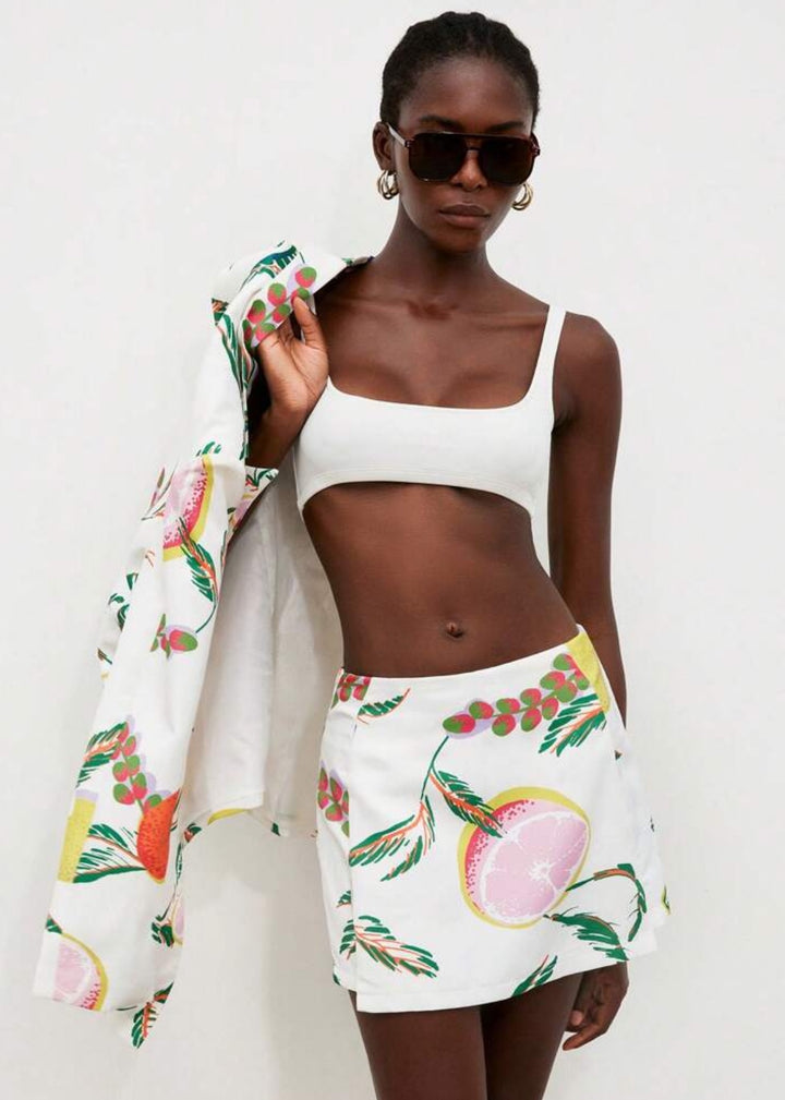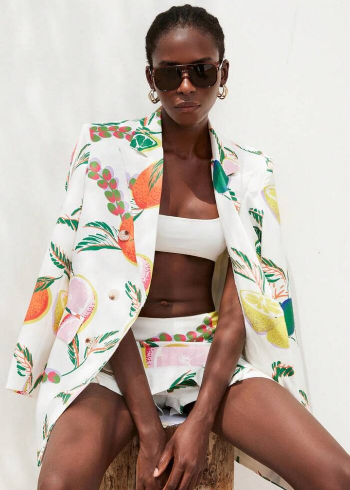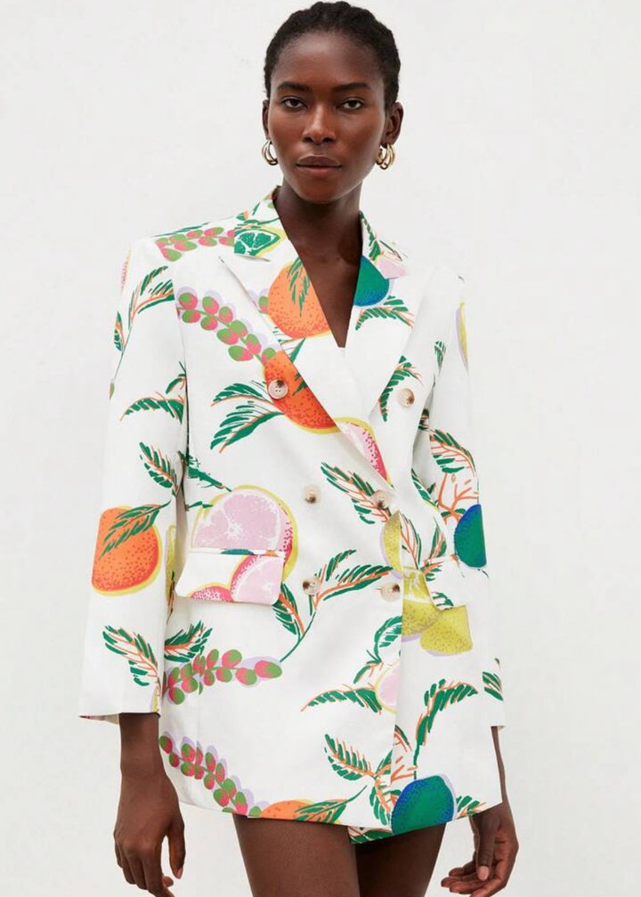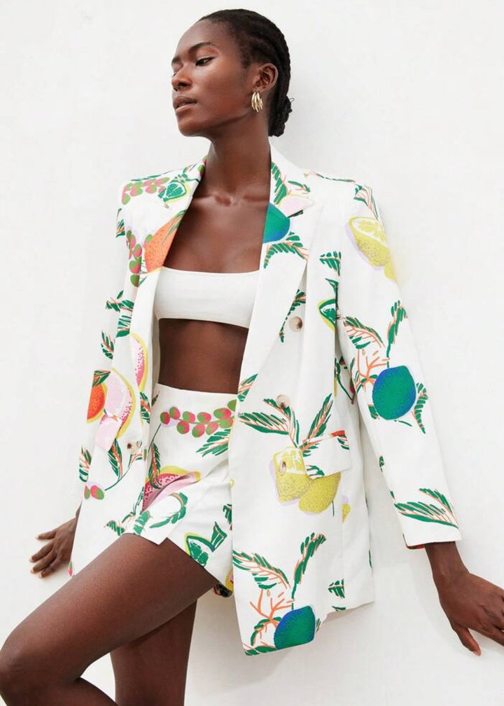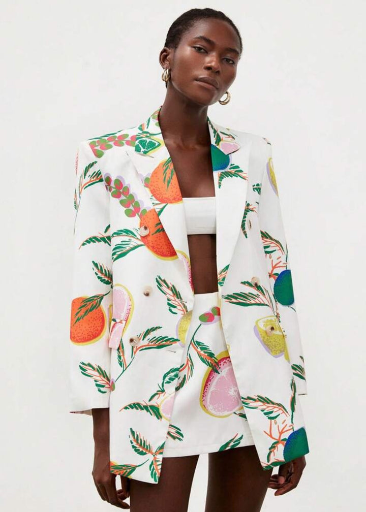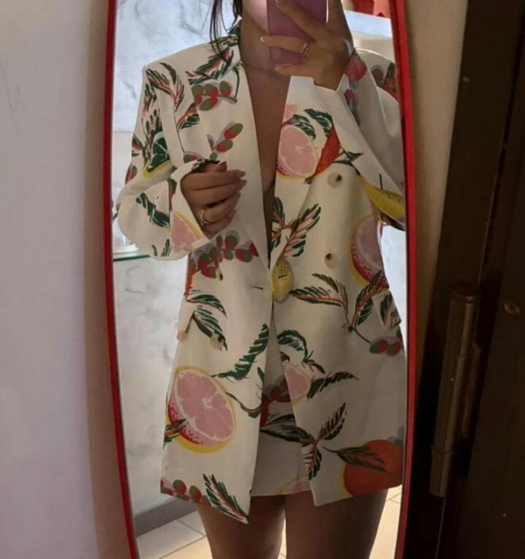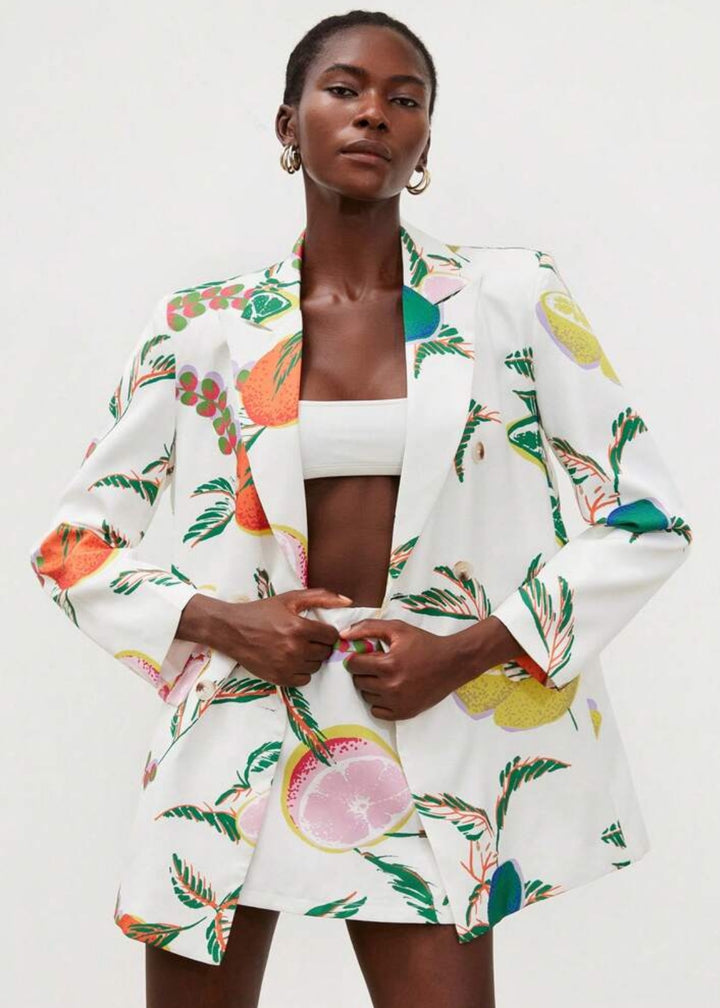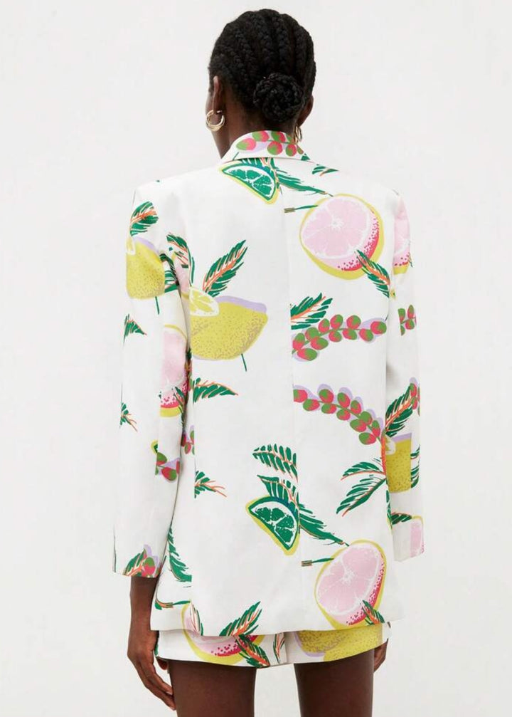 This two-piece set is a playful and vibrant ensemble, perfect for adding a touch of whimsy to your wardrobe. It features a stylish blazer adorned with a lively all-over fruit print, a classic lapel collar, and a single-button closure. The blazer is perfectly complemented by a matching mini skirt that continues the cheerful fruit pattern. This set offers a fun yet polished look, ideal for summer gatherings or a bold fashion statement.