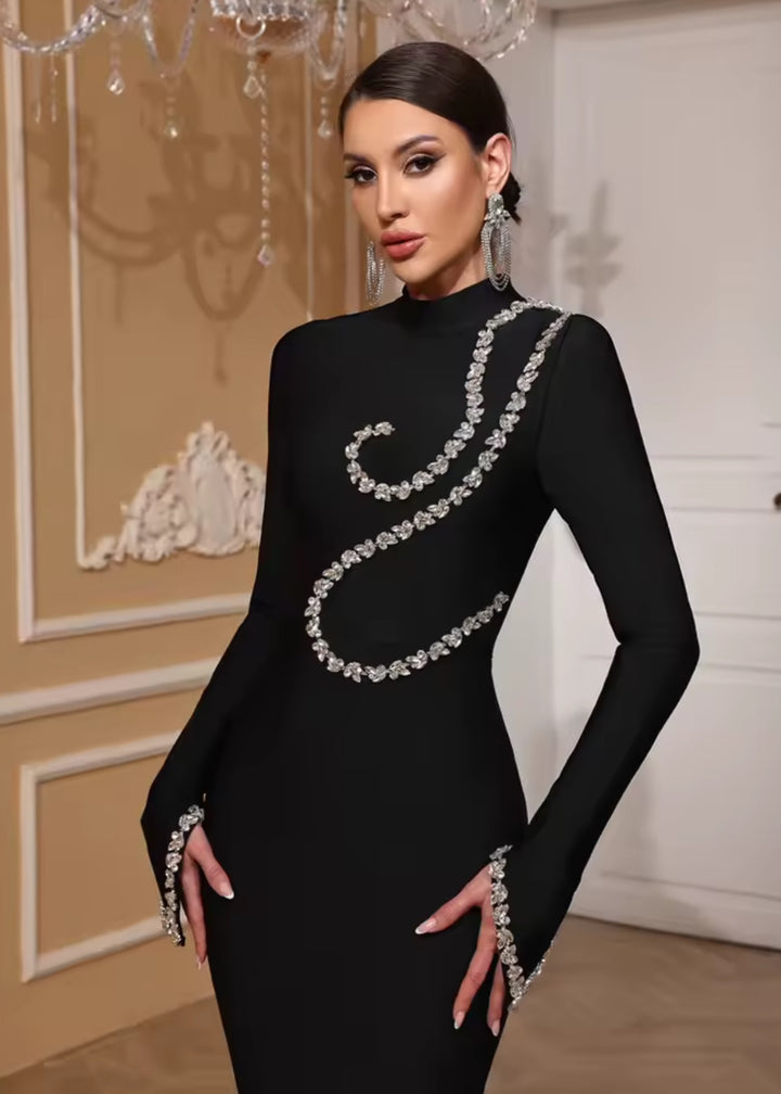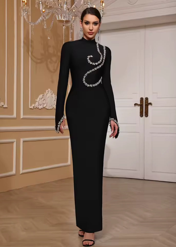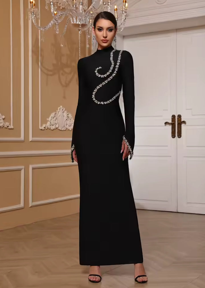 This sophisticated maxi dress features a refined high neckline and long, fitted sleeves, exuding timeless elegance. The dress is distinguished by delicate embellishments that trace a swirling pattern from the shoulder down the bodice and also adorn the cuffs of the sleeves, adding a touch of subtle sparkle and detail. The silhouette is form-fitting through the body, flowing into a floor-length skirt with a back slit for ease of movement. A concealed back zipper ensures a smooth and secure closure. This gown is a perfect choice for formal events, evening receptions, or any occasion requiring a polished and graceful look.