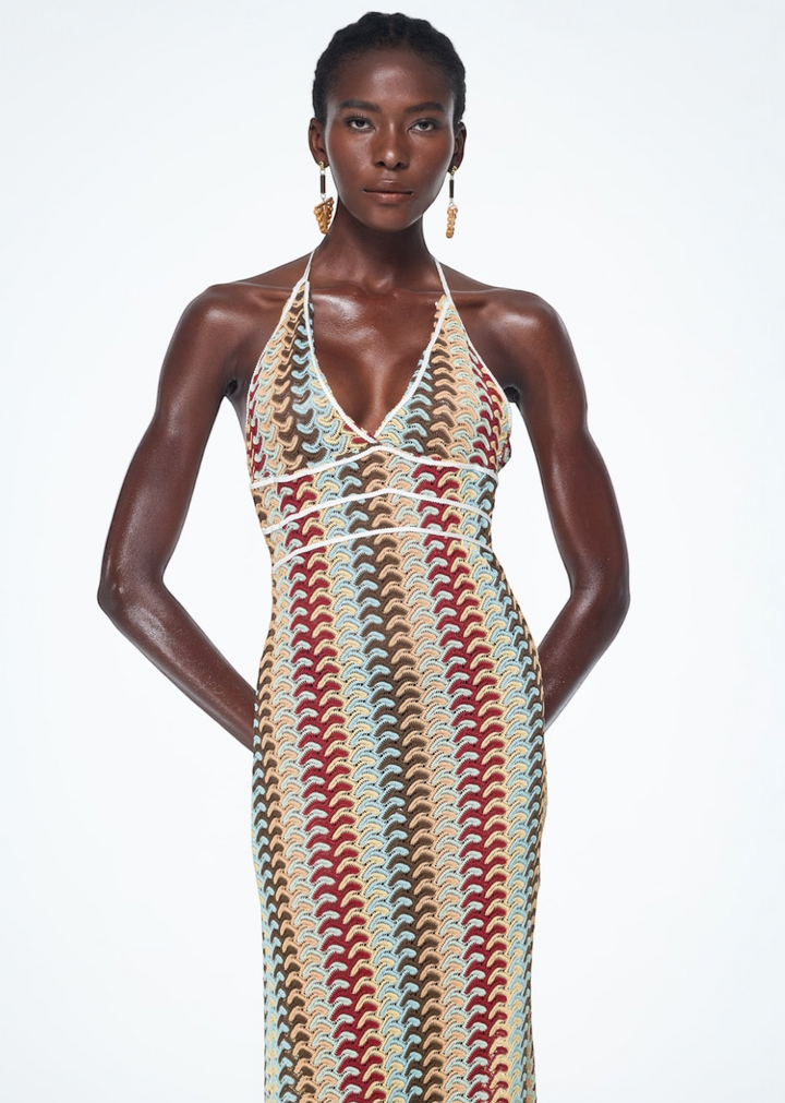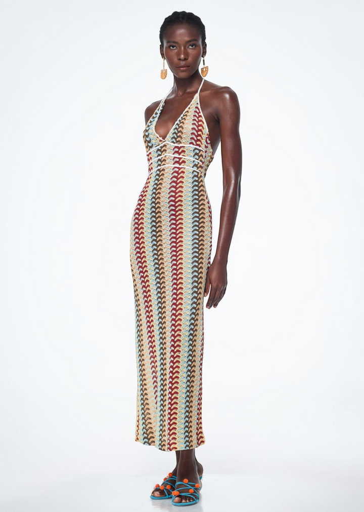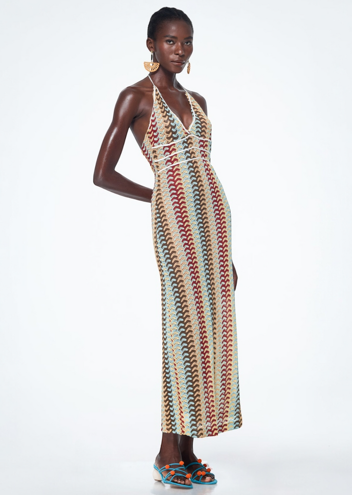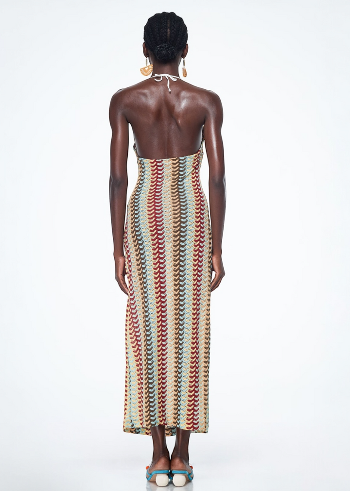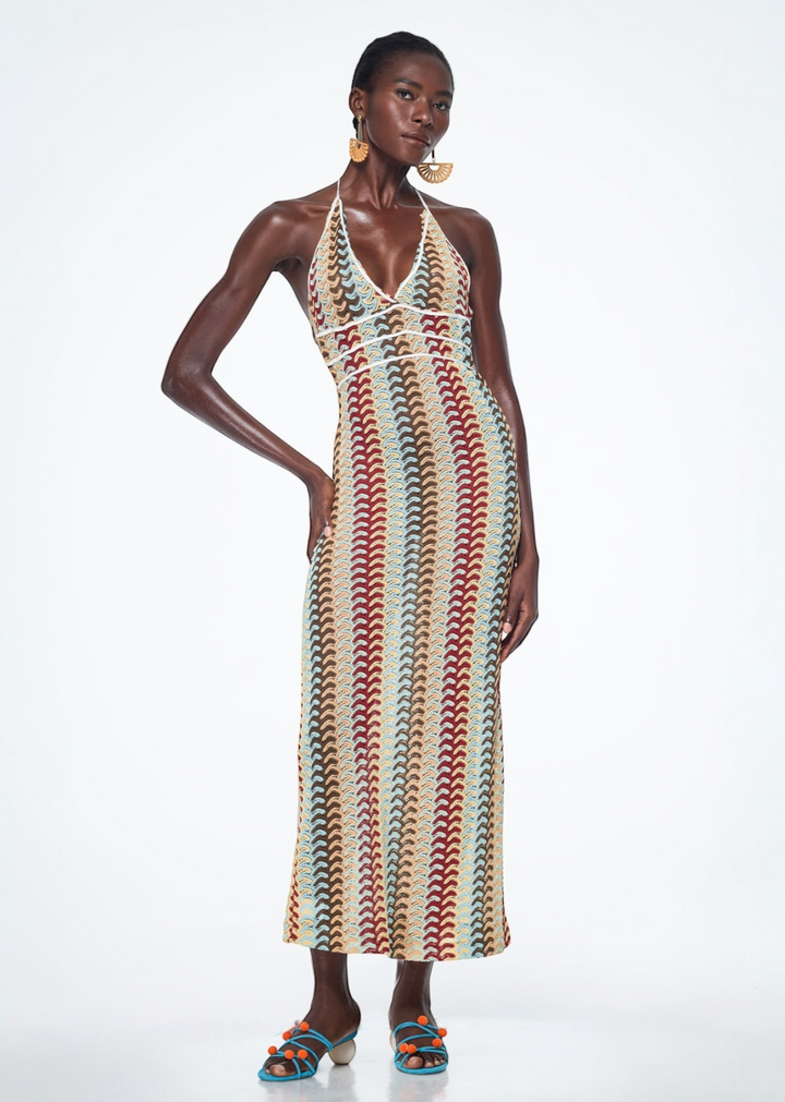 This midi-length dress features a halter neckline that ties at the nape of the neck, leaving the back exposed. The garment is crafted from a soft knit fabric with a distinctive wave pattern throughout. It offers a comfortable, body-hugging fit that flows to a straight hemline.