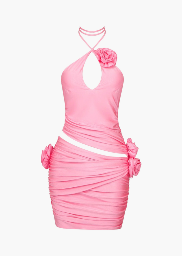 This mini dress is a playful and daring piece, perfect for a lively night out or a special event. It features a halter neckline that ties at the back of the neck, creating an open back design. The silhouette is a body-hugging mini dress, crafted from a stretch fabric that is generously ruched across the entire body, creating a flattering texture and enhancing the figure. A distinctive feature of this dress is the three-dimensional rose appliqué positioned at the hip, which adds a unique, sculptural detail and a touch of romantic flair. The combination of the halter neck, ruching, and the hip rose makes this dress a standout item.