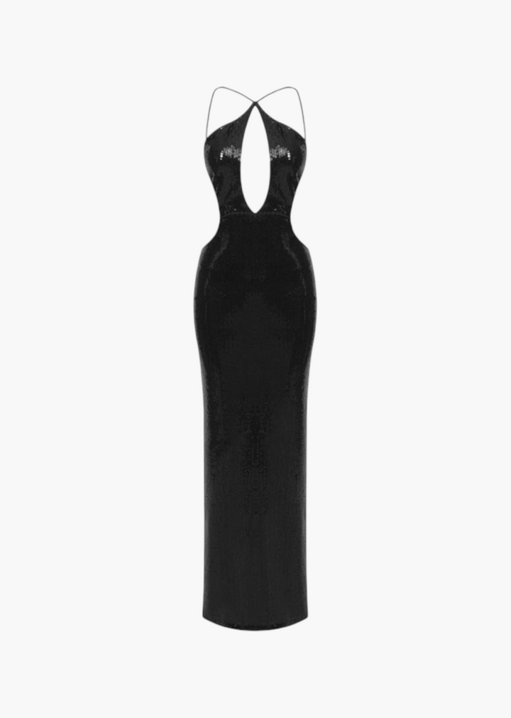 This gown is a masterpiece of modern evening wear, designed to make a dramatic and glamorous statement. The dress is entirely covered in dazzling sequins that sparkle with every movement, creating a captivating effect. A unique halter neckline transitions into a keyhole cutout on the front, offering a peek of skin. The sides of the dress feature daring cutouts that reveal the waist, leading to a stunning open back. The floor-length skirt is a sleek column silhouette with a subtle side slit, providing both elegance and ease of movement. This gown is an ideal choice for formal events, galas, or red-carpet occasions where you want to radiate confidence and sophistication.