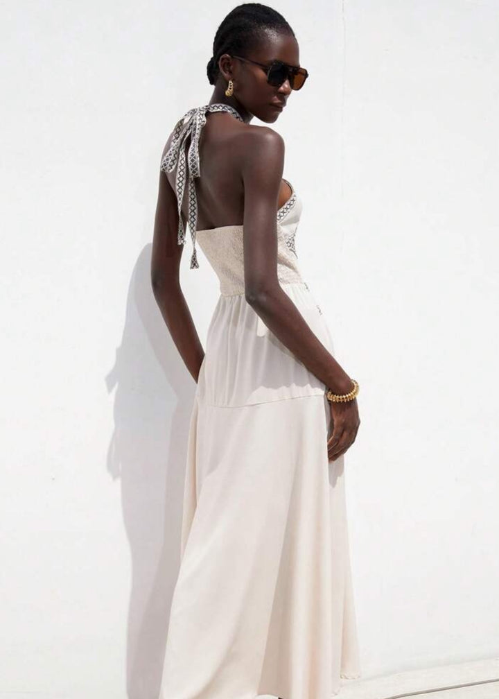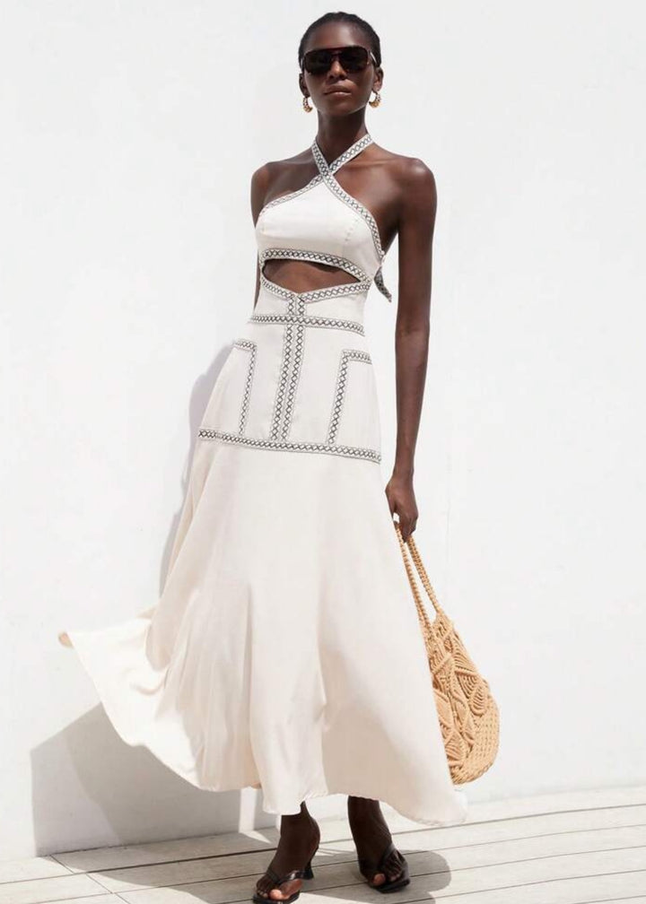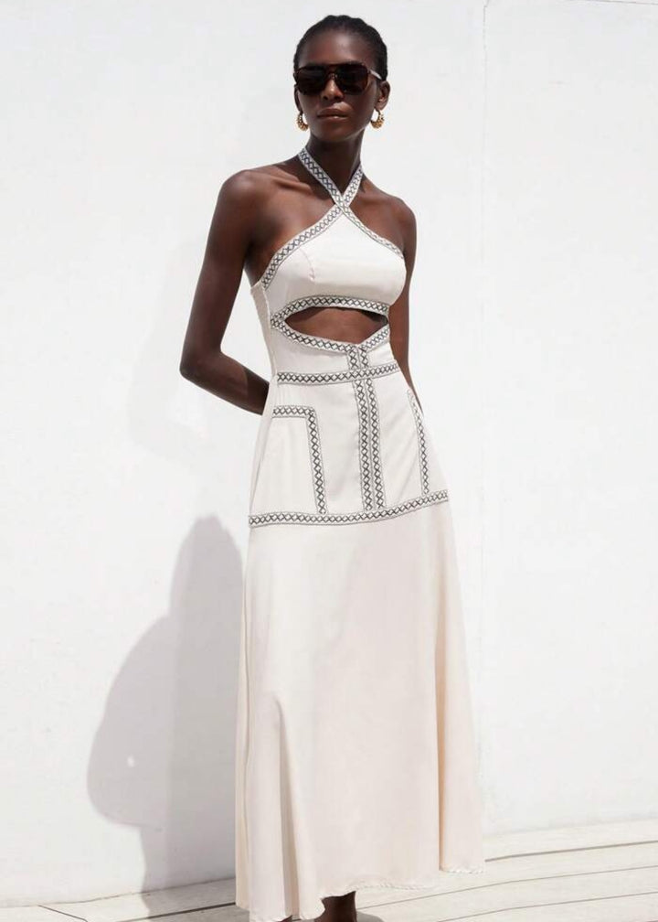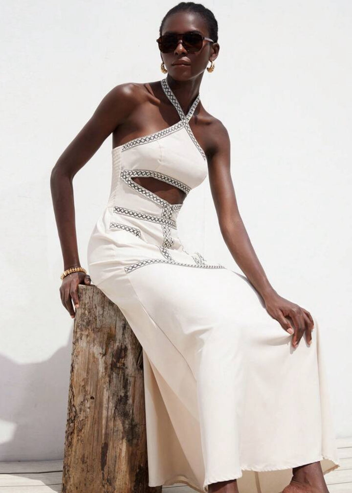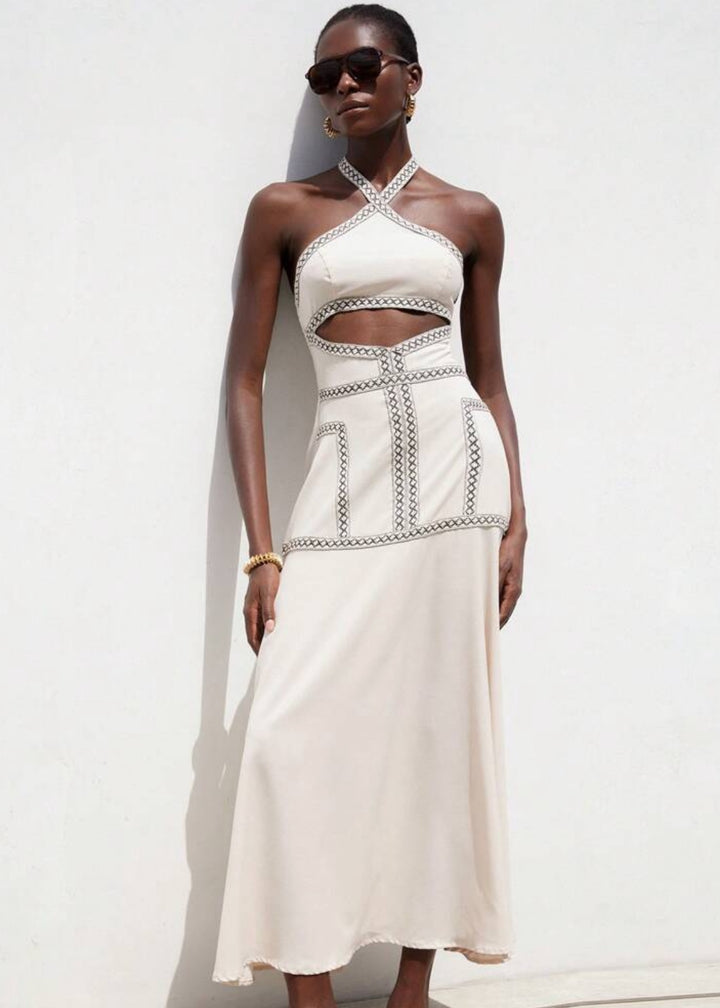 This maxi dress is a striking piece with its elegant and fluid design. It features a halter neckline that ties at the nape of the neck and geometric embroidery on the bodice. The dress has a unique midriff cutout and a flowy skirt. The dress's unique details make it perfect for warm weather occasions or special events.